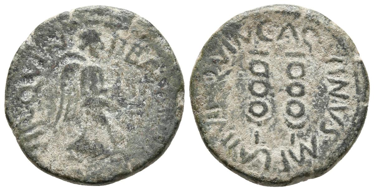 CARTAGONOVA. Semis. Epoca de Augusto. 27 a.C.-14 d.C. Cartagena (Murcia). A/ Victoria a derecha. P. BAEBIVS POLLIO II VIR. QVIN. R/ Insignias militares. C. AQVINVS MELA II VIR. QVIN. FAB-580. Ae. 5,22g. MBC-/MBC.