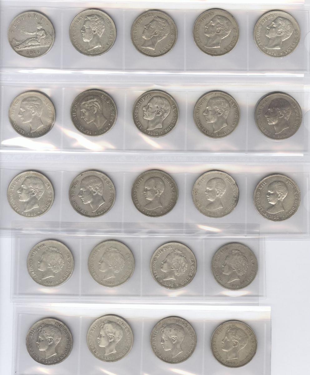CENTENARIO DE LA PESETA. Colección avanzada compuesto por 23 monedas de 5 Pesetas comprendiendo Gobierno Provisional, Amadeo I, Alfonso XII y Alfonso XIII, Todas diferentes. 1870 *18-70 SNM, 1871 *18-71 SDM, 1871 *18-75 DEM, 1875 *18-75 DEM, 1876 *__-76 DEM, 1878 *__-__ DEM, 1878 *18-78 EMM, 1883 *18-83 MSM, 1884 *18-84 MSM, 1885 *18-85 MSM, 1885 *18-86 MSM, 1885 *18-87 MPM, 1889 *18-89 MPM, 1890 *18-90 PGM, 1892 *18-92 PGM, 1892 *18-9_ PGM, 1893 *18-__ PGL, 1893 *_8-__ PGV, 1894 *18-__ PGV, 1896 *18-96 PGV, 1897 *18-97 SGV, 1898 *18-98 SGV y 1899 *18-__ SGV. Ar. BC+/MBC+. IMPRESCINDIBLE EXAMINAR.