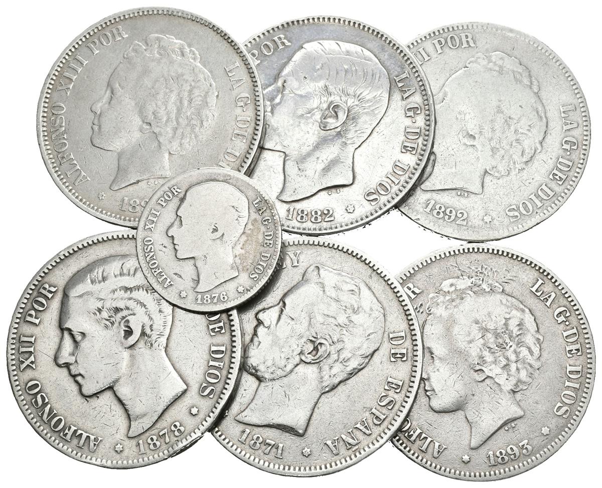 CENTENARIO DE LA PESETA. Lote compuesto por 7 monedas de plata, conteniendo: Amadeo I. 5 Pesetas 1871 *75; Alfonso XII. 1 Peseta 1876, 5 Pesetas 1878, 1882 y Alfonso XIII. 5 Pesetas 1892 y 1893 (2). Ar. BC/MBC-. A EXAMINAR.