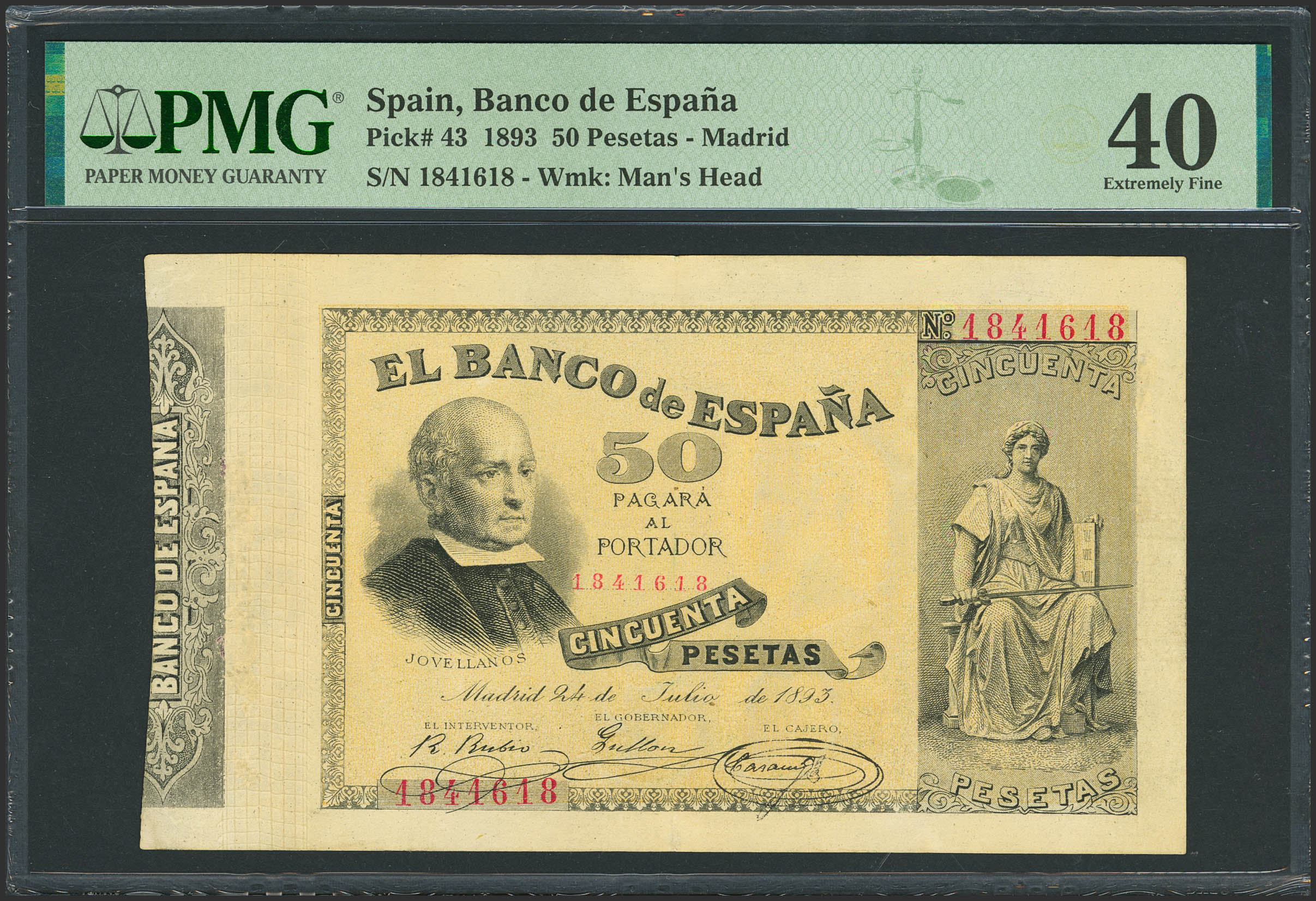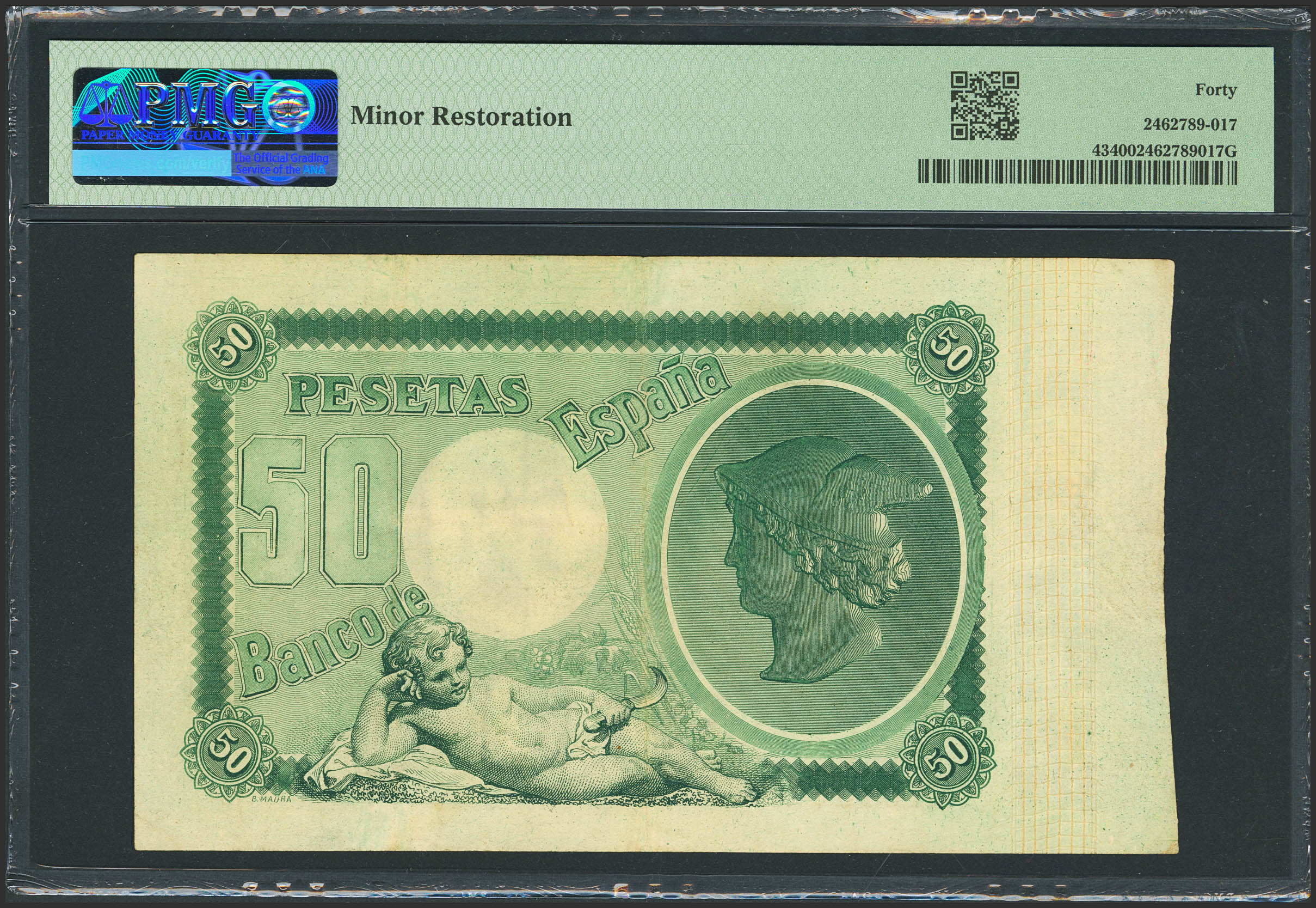 50 Pesetas. 24 de Julio de 1893. Sin serie. (Edifil 2023: 301, Pick: 43). Raro, especialmente en esta calidad, mínimamente reparado. EBC-. Encapsulado PMG40 (minor restoration) (para hacernos idea de la rareza, a fecha 1 de Enero de 2026, este billete es el quinto mejor calificado junto a otro billete en PMG)