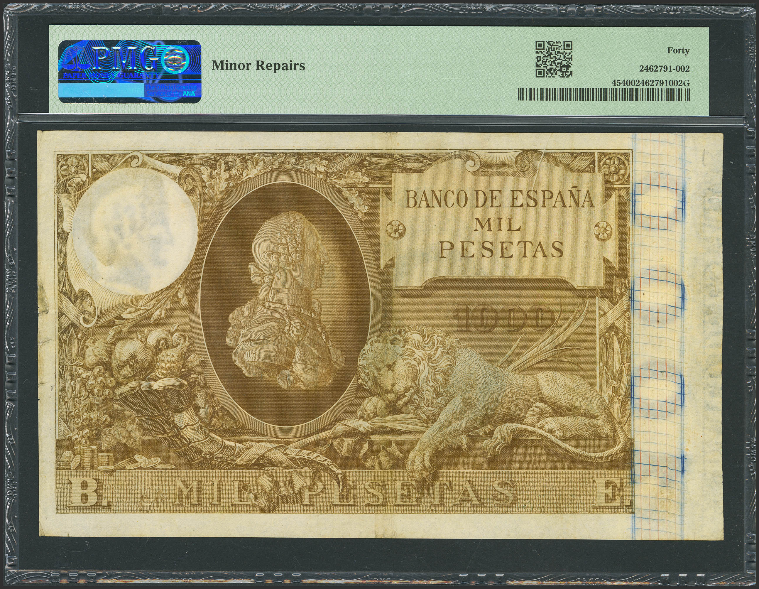 1000 Pesetas. 1 de Mayo de 1895. Sin serie. (Edifil 2023: 303, Pick: 45). Muy raro, especialmente en esta calidad, mínimamente reparado. EBC-. Encapsulado PMG40 (minor repairs).