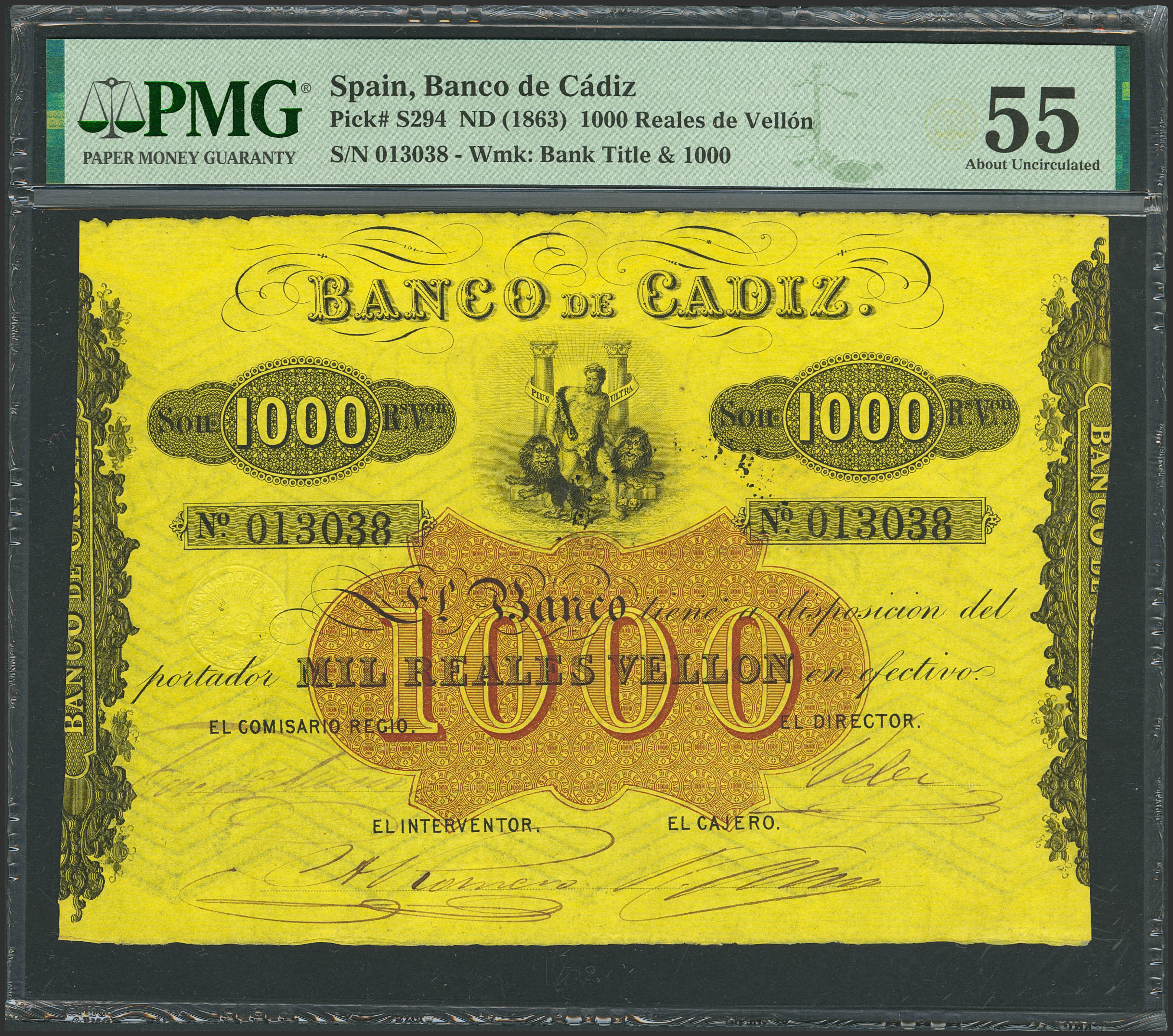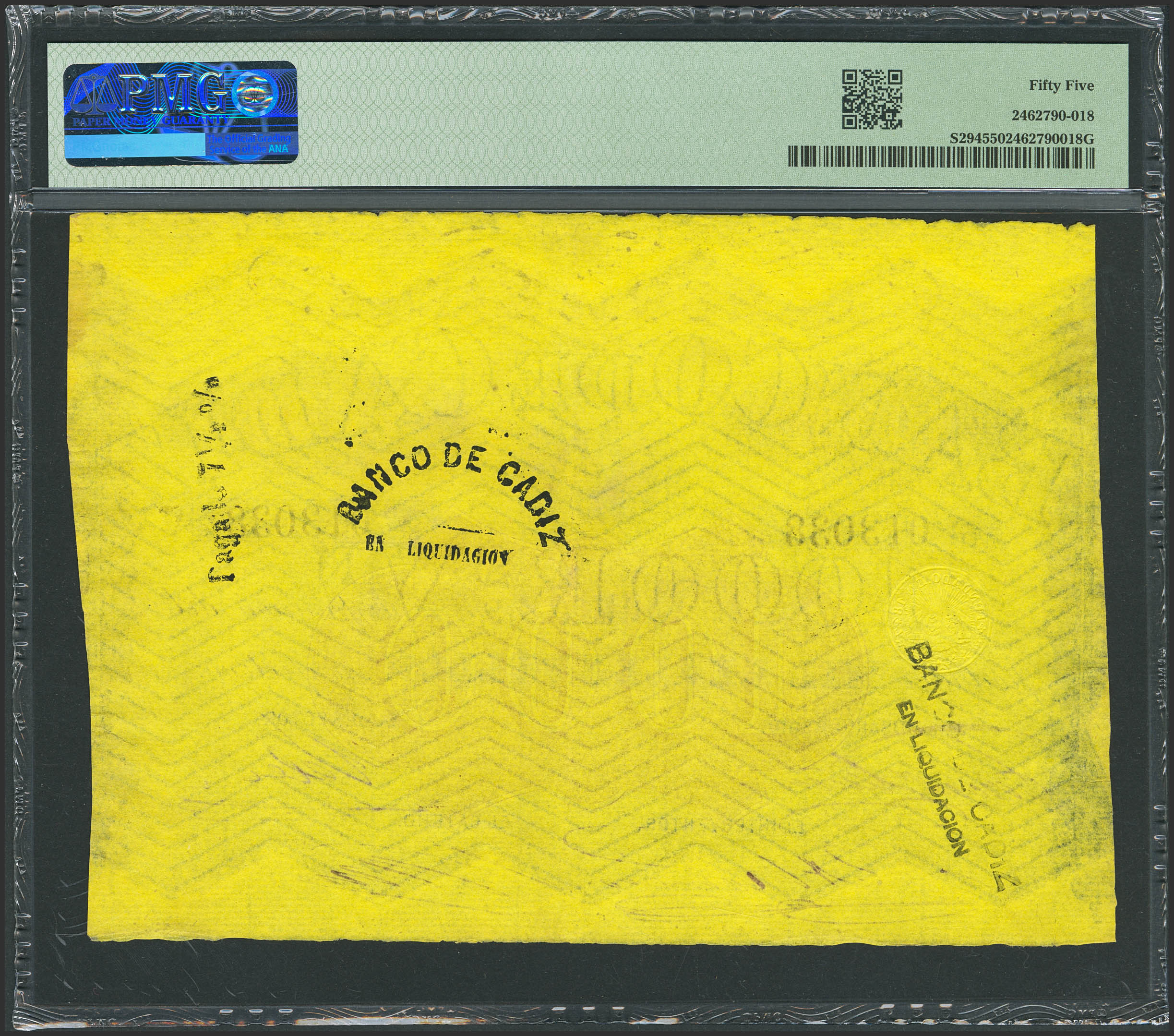 BANCO DE CADIZ. 1000 Reales de Vellón. III Emisión. (sin fechar). Sin serie. (Edifil 2023: 81, Pick: S294). Rarísimo en esta calidad. EBC+ Encapsulado PMG55.