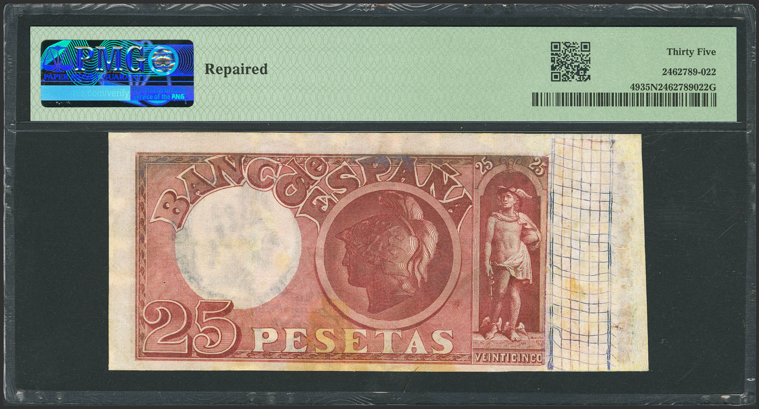 25 Pesetas. 17 de Mayo de 1899. Serie M. (Edifil 2023: 306a, Pick: 49). Raro, profusamente reparado. MBC+. Encapsulado PMG35NET (repaired).