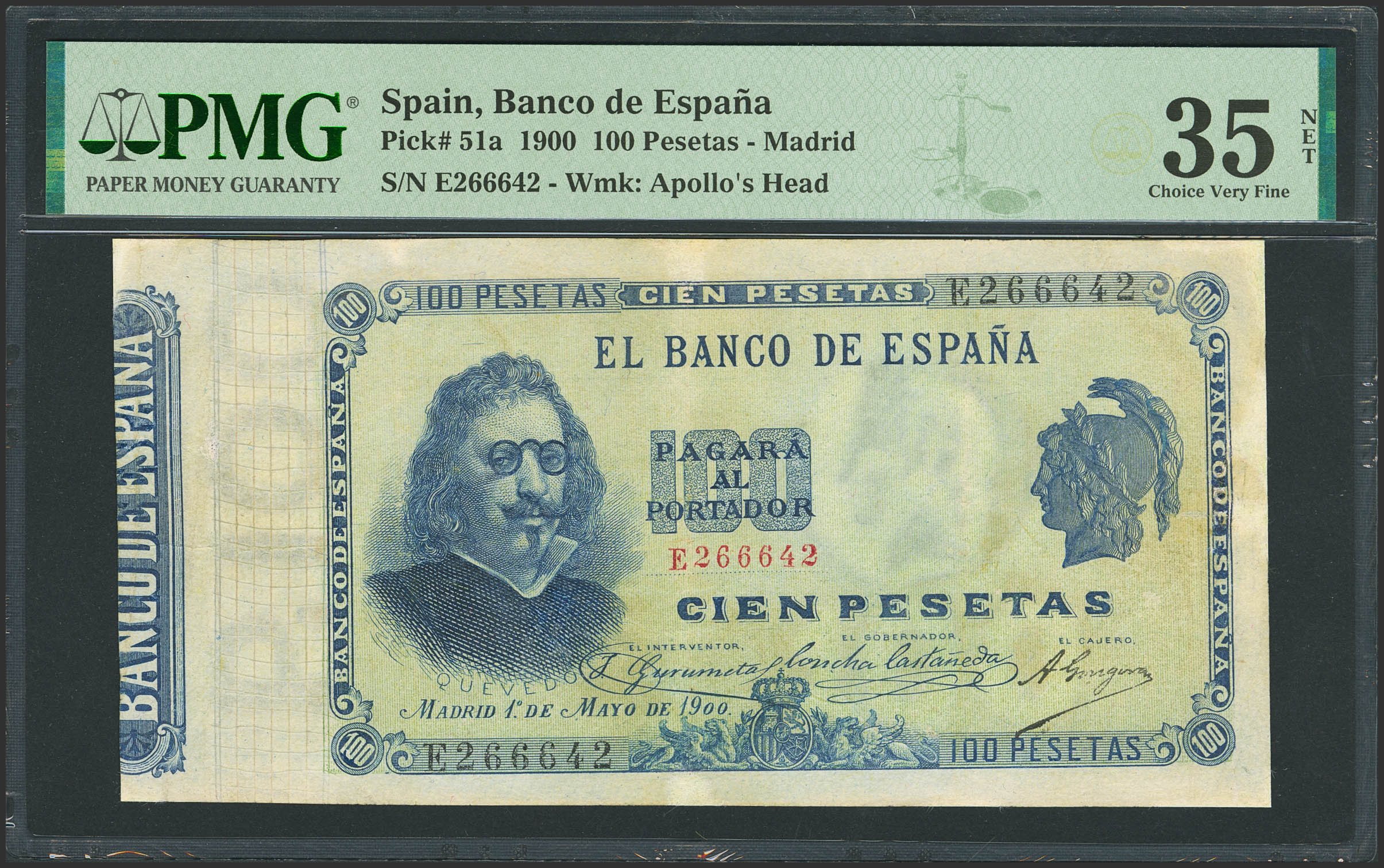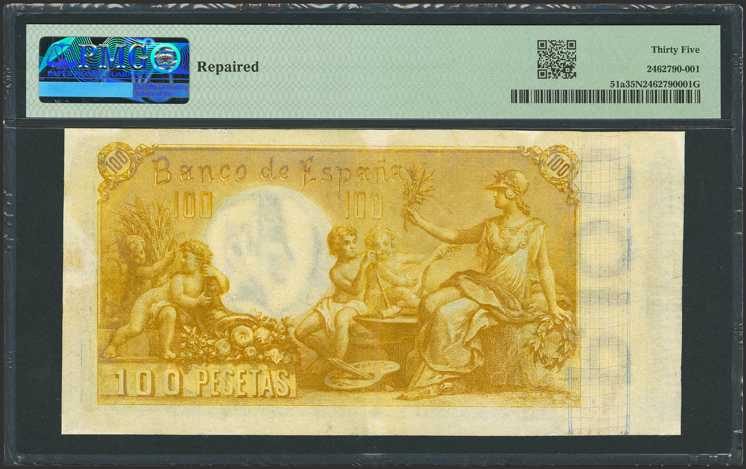 100 Pesetas. 1 de Mayo de 1900. Serie E. (Edifil 2023: 308a, Pick: 51). Raro, reparado. MBC+. Encapsulado PMG35NET (repaired).