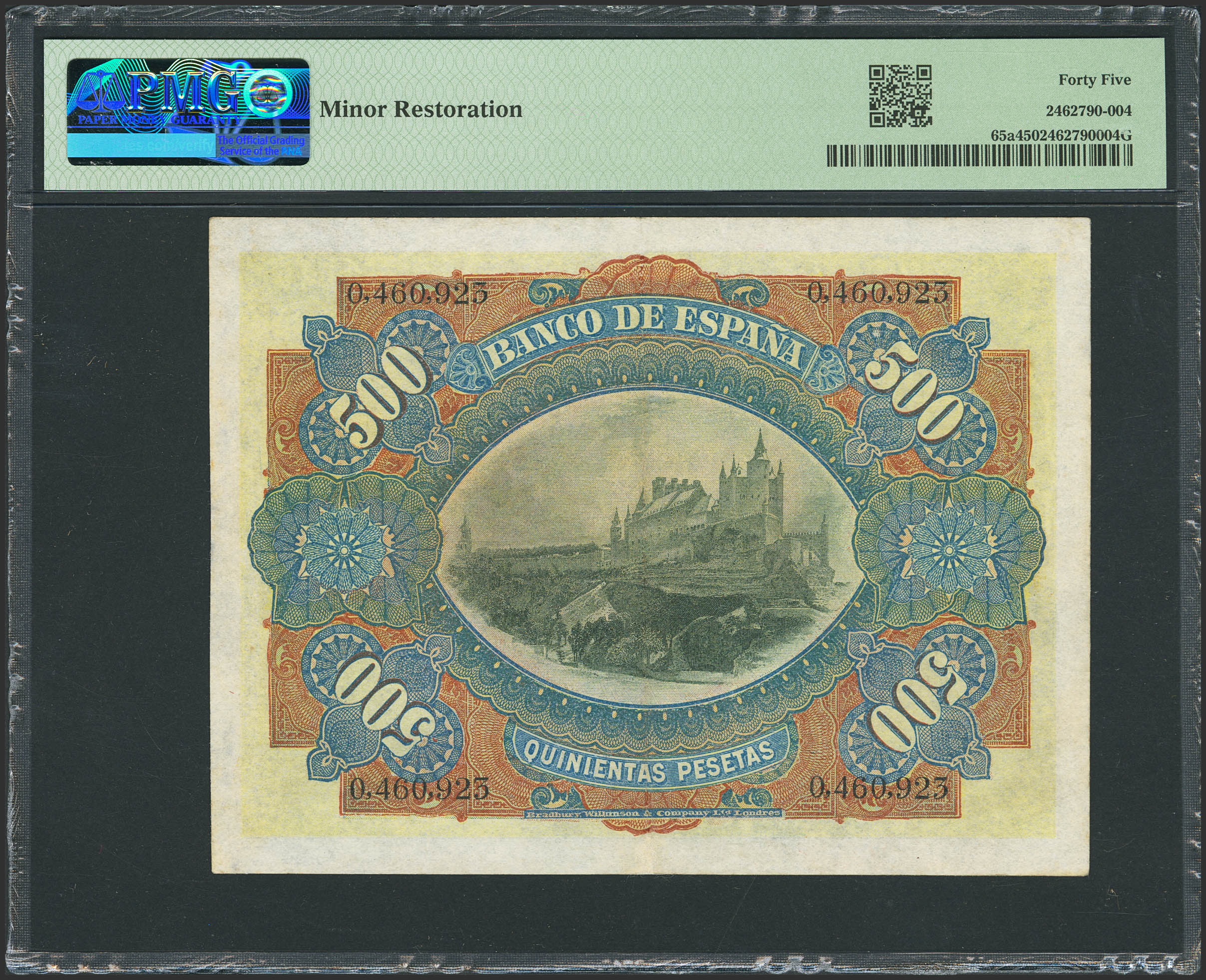 500 Pesetas. 15 de Julio de 1907. Sin serie. (Edifil 2023: 321, Pick: 65a). Raro, mínimamente reparado. EBC-. Encapsulado PMG45 (minor restoration).