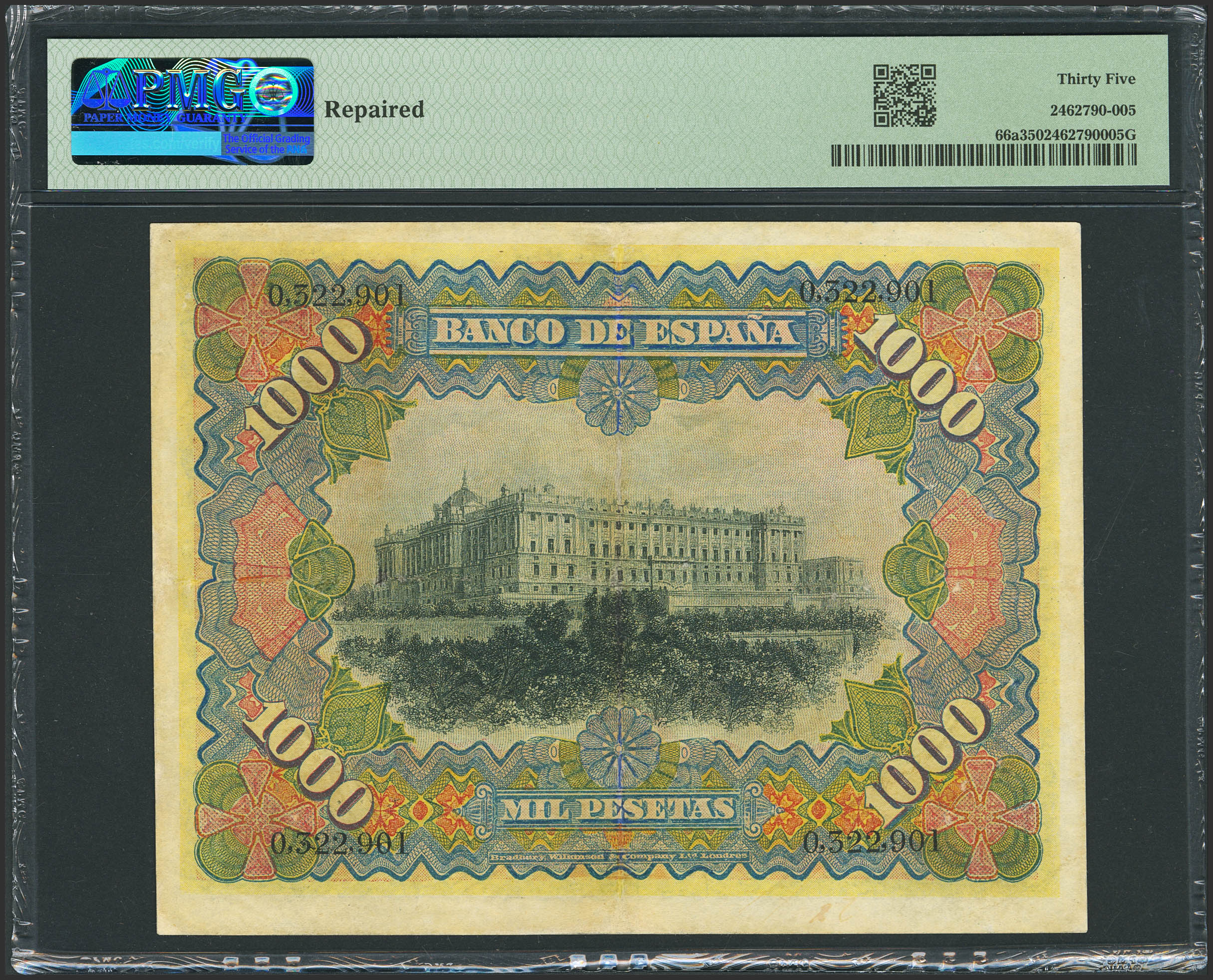 1000 Pesetas. 15 de Julio de 1907. Sin serie. (Edifil 2023: 322, Pick: 66a). Raro, reparado. MBC+. Encapsulado PMG35 (repaired).