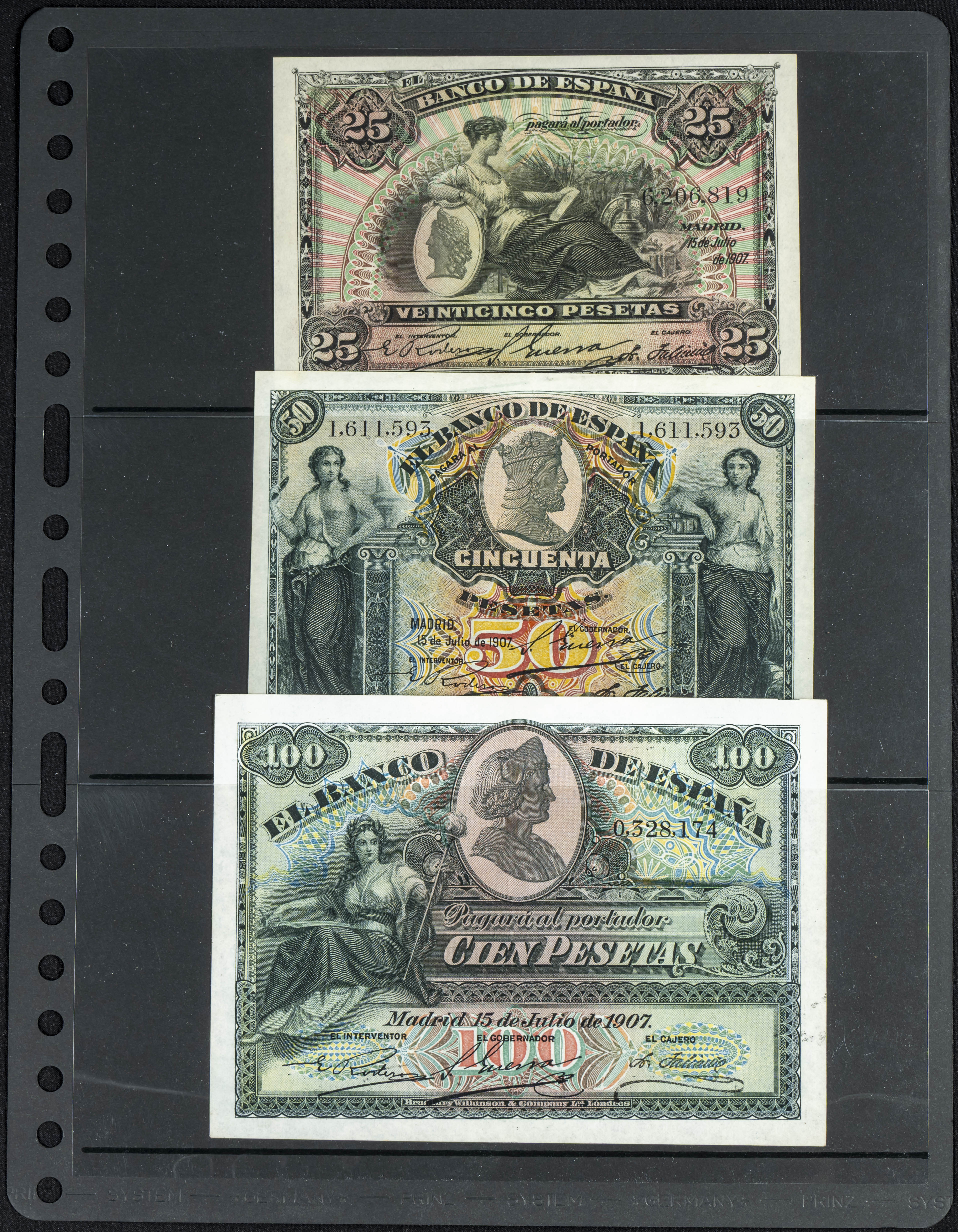 25 Pesetas y 50 Pesetas, emitidos el 24 de Septiembre de 1906, con las series B y A, respectivamente, el 100 Pesetas, emitido el 30 de Junio de 1906, con la serie C y 25 Pesetas, 50 Pesetas y 100 Pesetas, emitidos 15 de Julio de 1907, todos ellos sin serie (Edifil 2023: 313a, 314a, 315a, 318, 319, 320). A EXAMINAR.