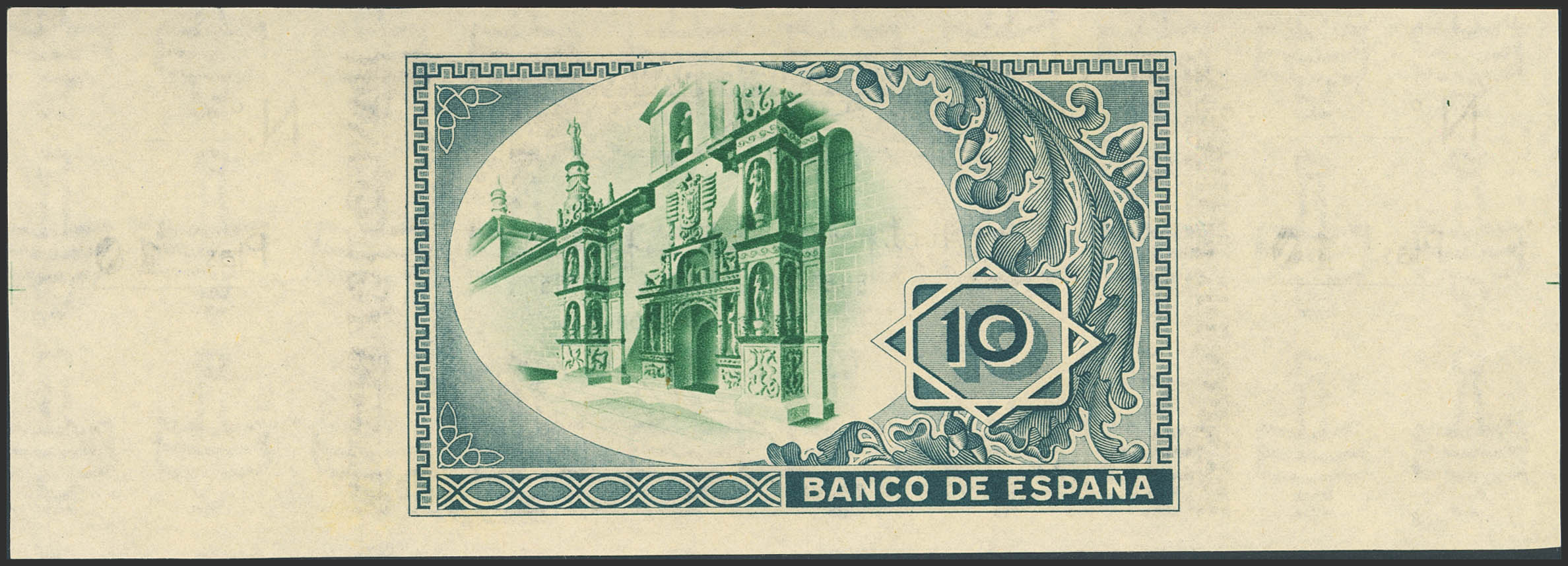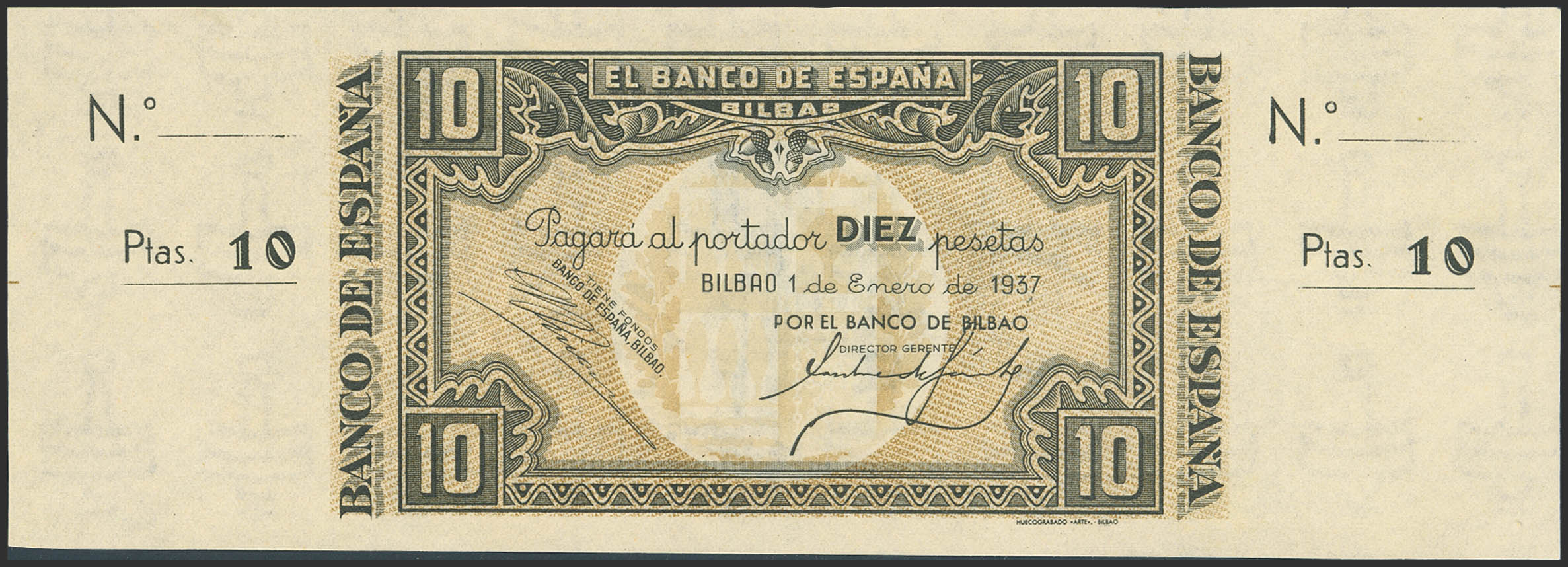 10 Pesetas. 1 de Enero de 1937. Sucursal de Bilbao, antefirma Banco de Bilbao. Sin serie y sin numeración, con ambas matrices. (Edifil 2023: 387a). Apresto original. SC.