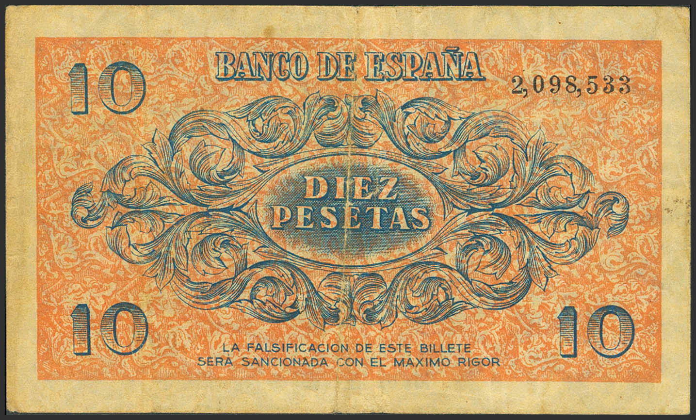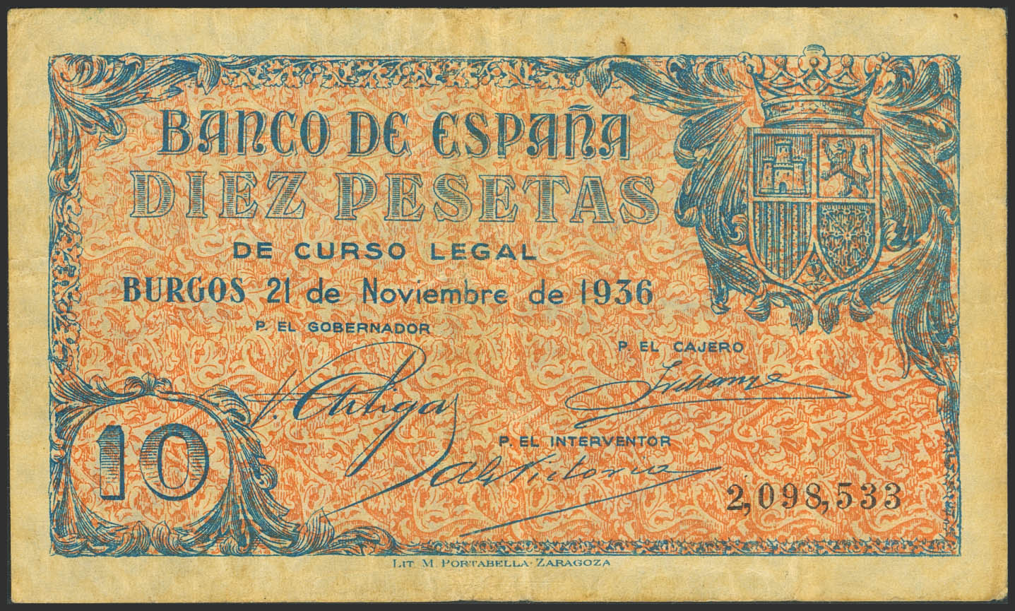 10 Pesetas. 21 de Noviembre de 1936. Sin serie. (Edifil 2023: 418). MBC.