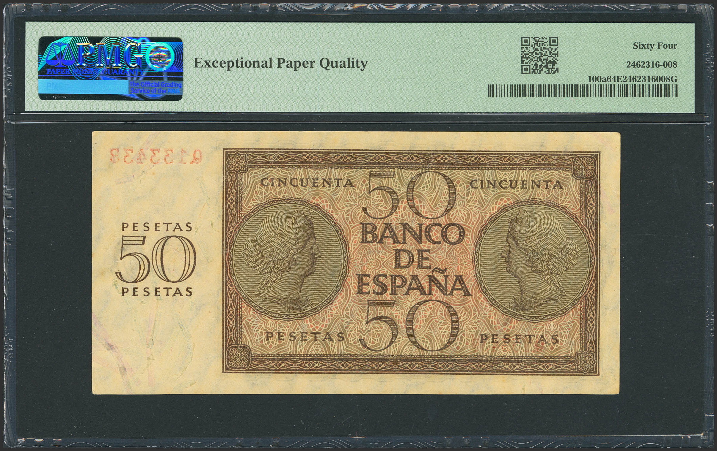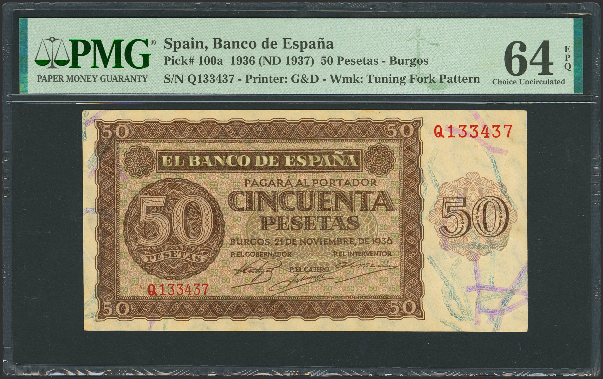 50 Pesetas. 21 de Noviembre de 1936. Serie Q. (Edifil 2023: 420a, Pick: 100). Apresto original, inusual en esta calidad. SC. Encapsulado PMG64EPQ.