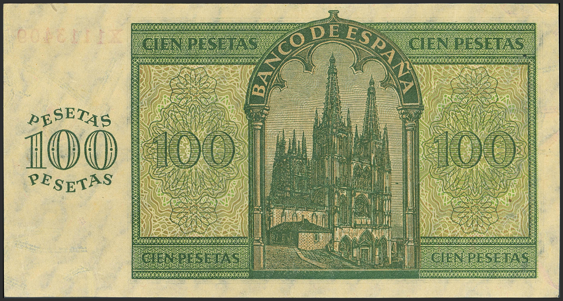 100 Pesetas. 21 de Noviembre de 1936. Serie X, última serie emitida. (Edifil 2023: 421b). Apresto original. EBC++.