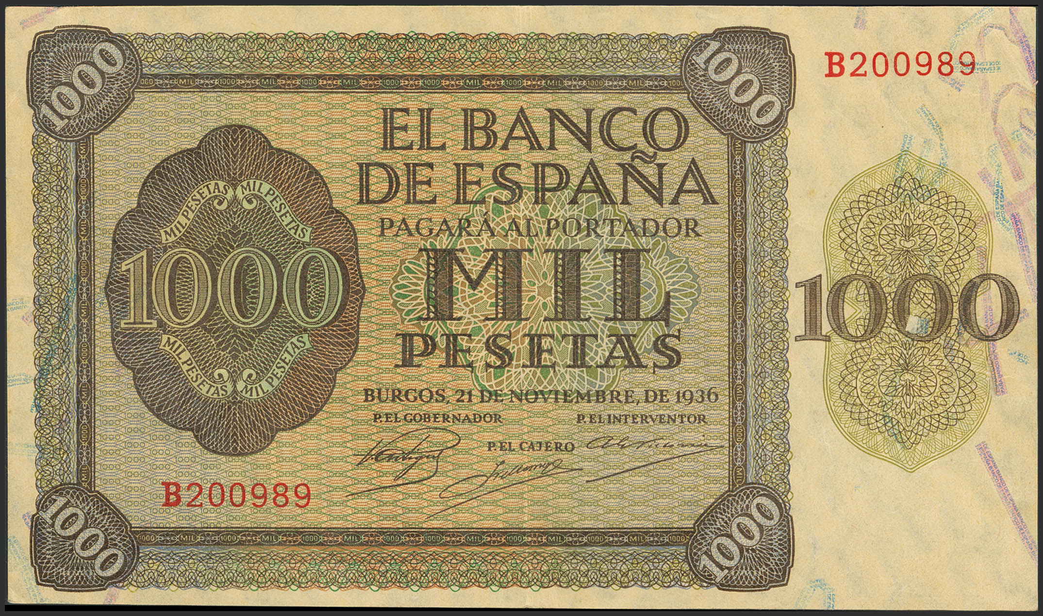 1000 Pesetas. 21 de Noviembre de 1936. Serie B. (Edifil 2023: 423a). Billete de gran presencia, conserva gran parte del apresto original. EBC.