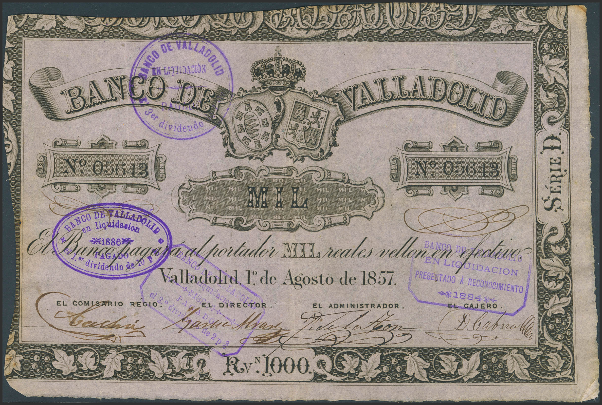 1000 Reales de Vellón. 1 de Agosto de 1857. Banco de Valladolid. Serie D. (Edifil 2023: 134). Raro, ínfimos puntitos de aguja. MBC+.