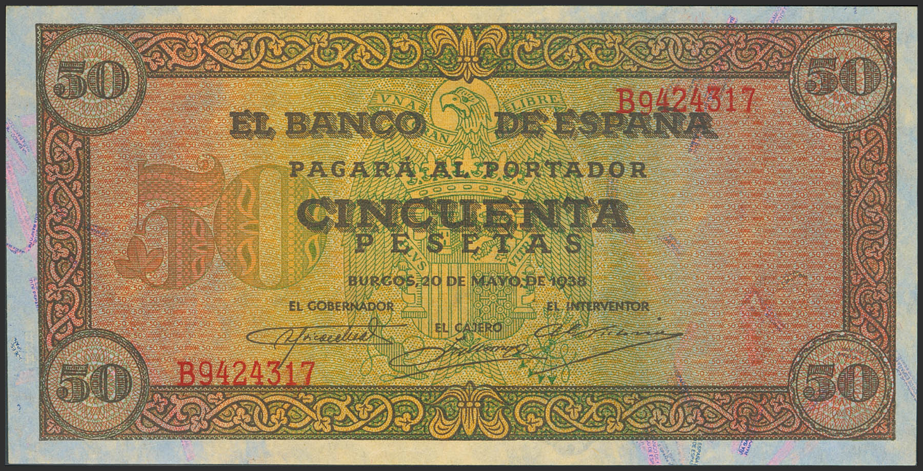 50 Pesetas. 20 de Mayo de 1938. Serie B. (Edifil 2023: 431a). Apresto original, arruguitas naturales del papel (este es el único motivo de "quitarle" el SC). EBC+++.