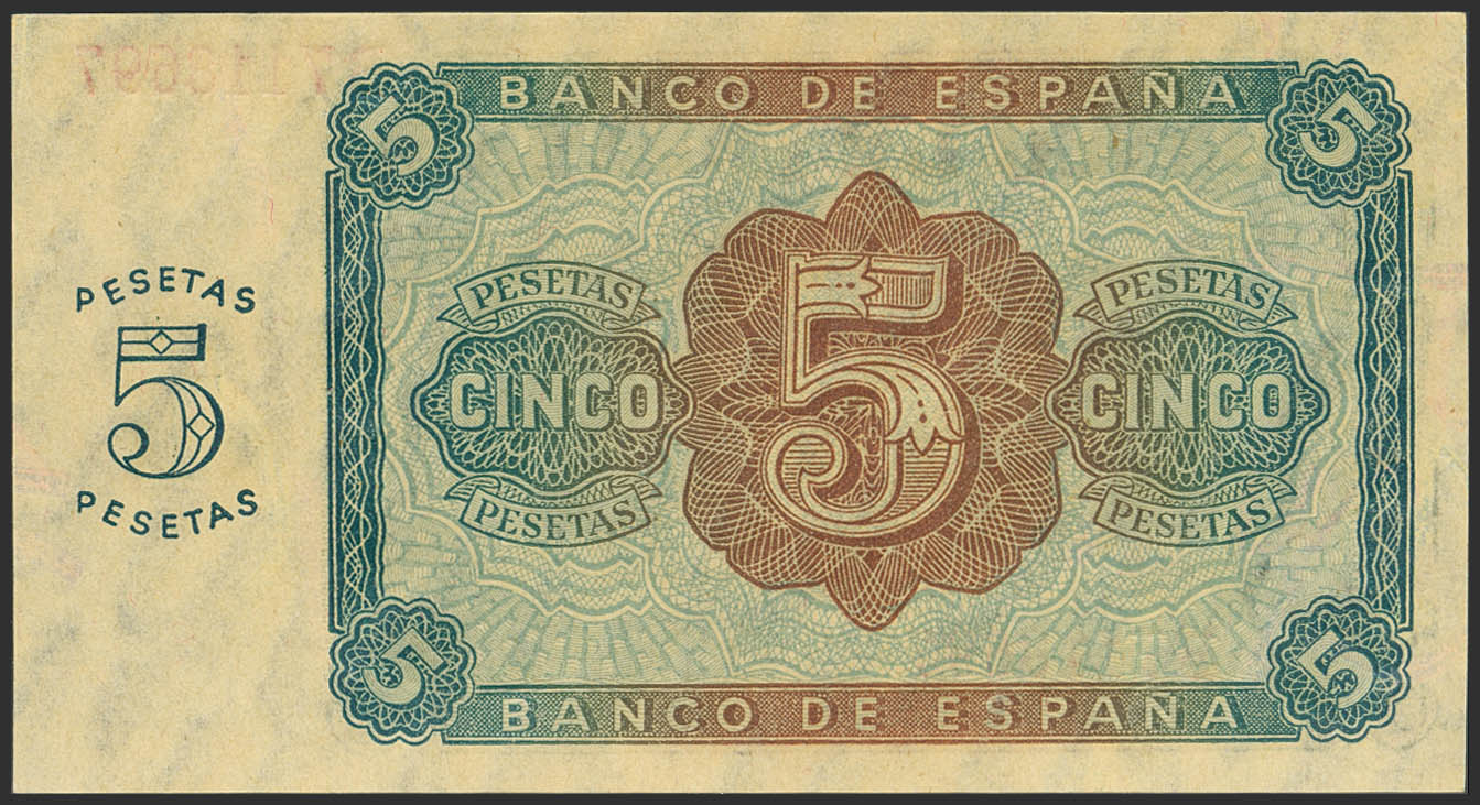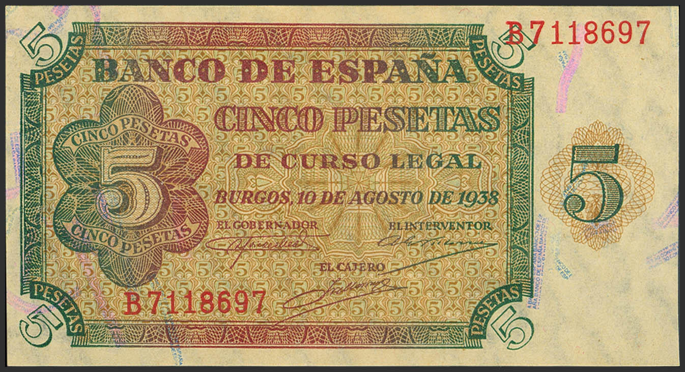 5 Pesetas. 10 de Agosto de 1938. Serie B. (Edifil 2023: 435a). Apresto original. SC.