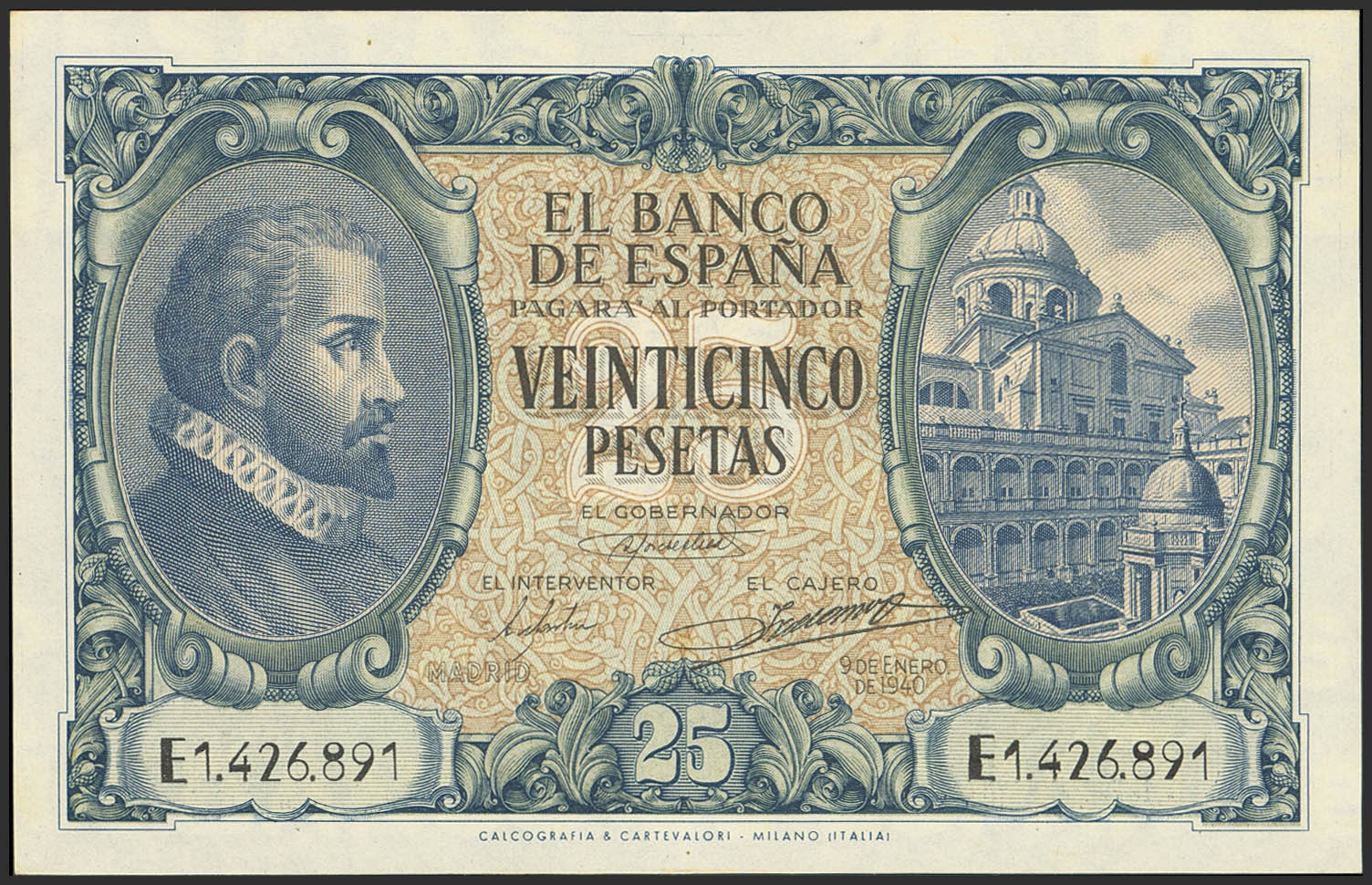 25 Pesetas. 9 de Enero de 1940. Serie E. (Edifil 2023: 436a). Conserva gran parte del apresto original. EBC+.