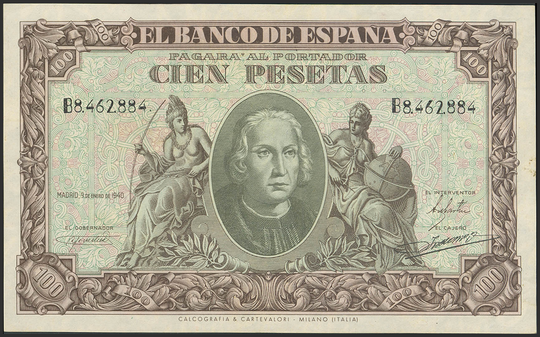 100 Pesetas. 9 de Enero de 1940. Serie B. (Edifil 2023: 438a). Conserva parte del apresto original. EBC-.