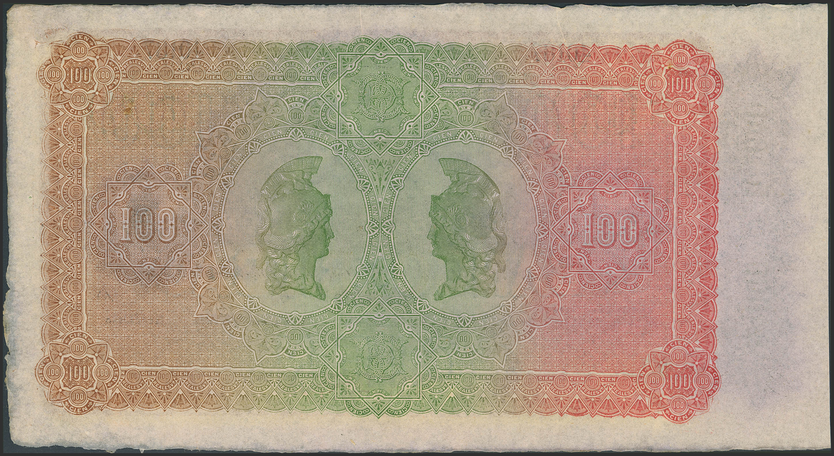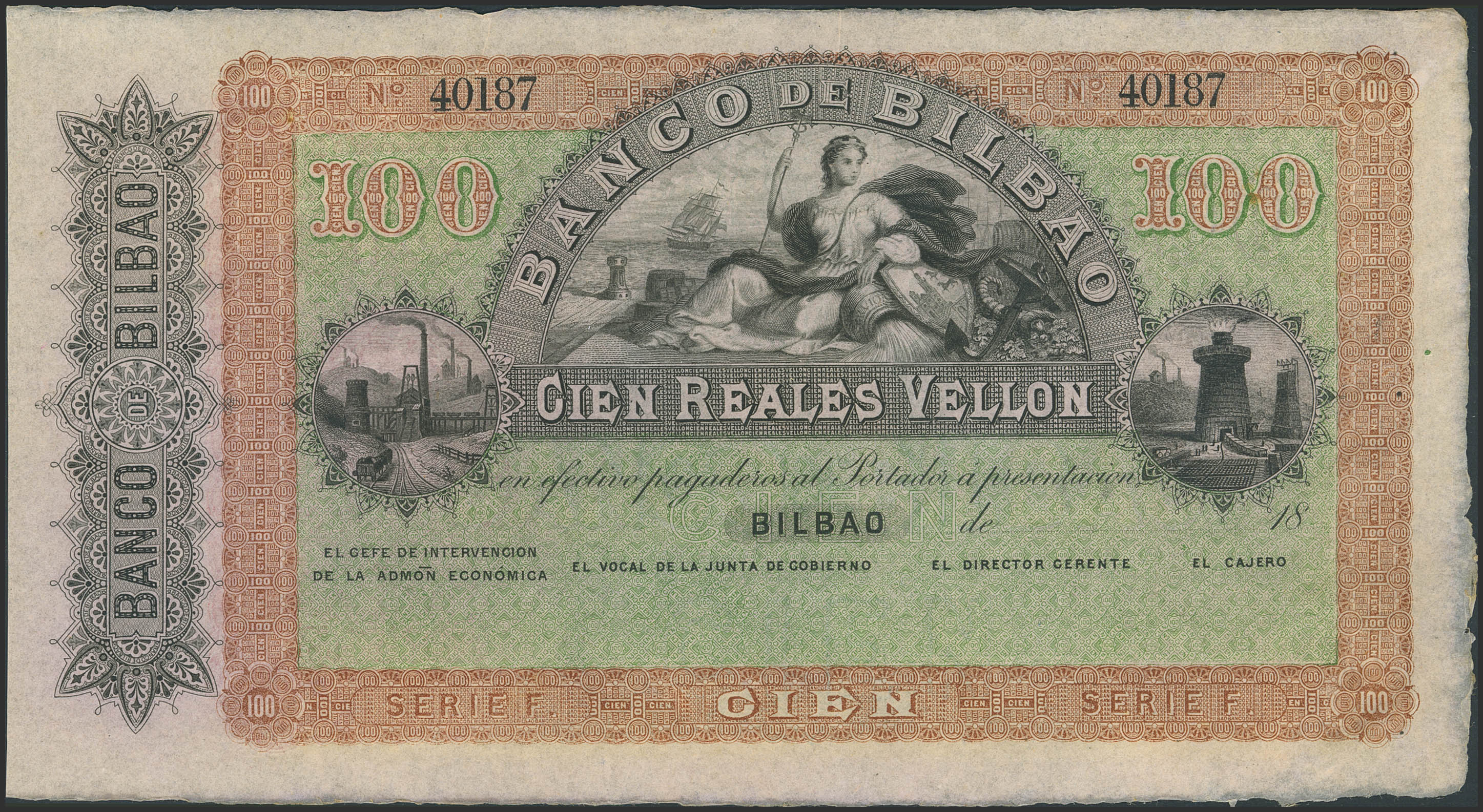 100 Reales. 21 de Agosto de 1857. Banco de Bilbao. Serie F, sin firmas y con numeración. (Edifil 2023: 143). Raro, ínfimos puntitos de aguja. SC-.