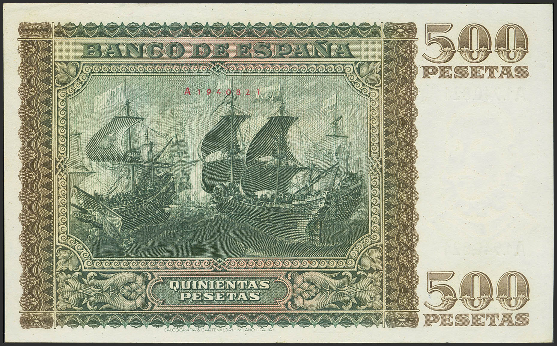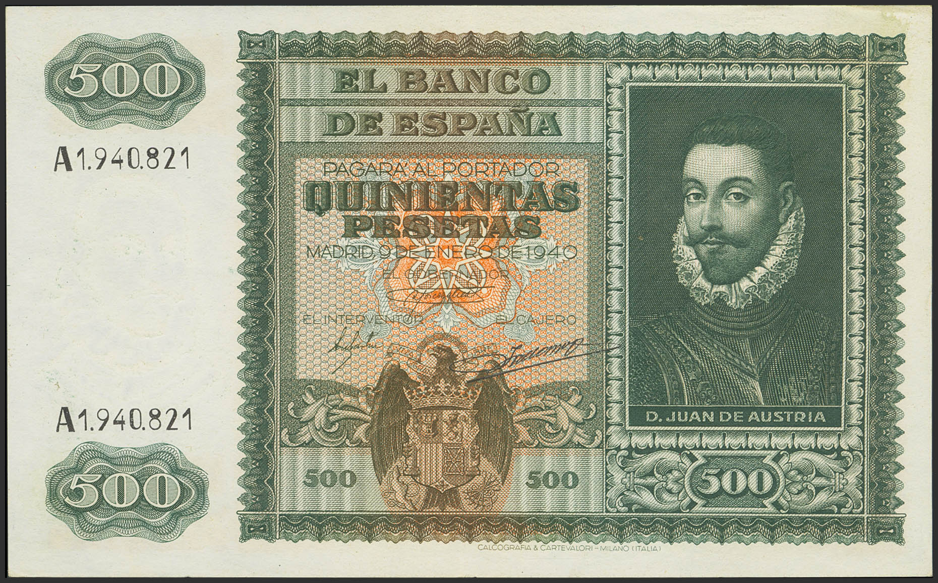 500 Pesetas. 9 de Enero de 1940. Serie A. (Edifil 2023: 439). Billete de gran presencia, conserva gran parte del apresto original. EBC.