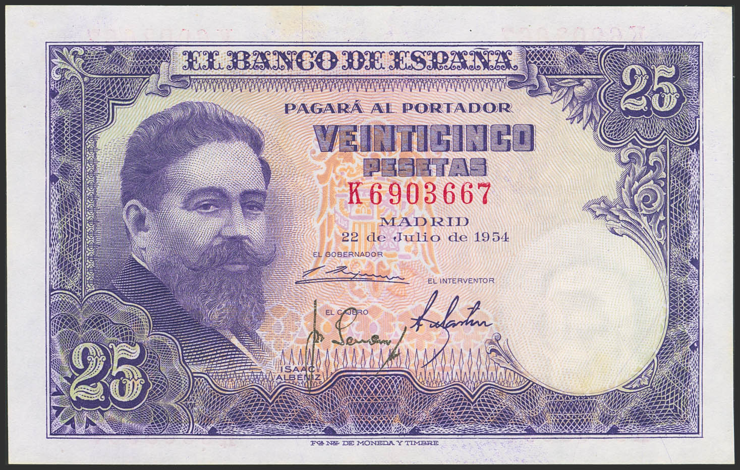 25 Pesetas. 22 de Julio de 1954. Serie K. (Edifil 2023: 467a). Apresto original. EBC++.