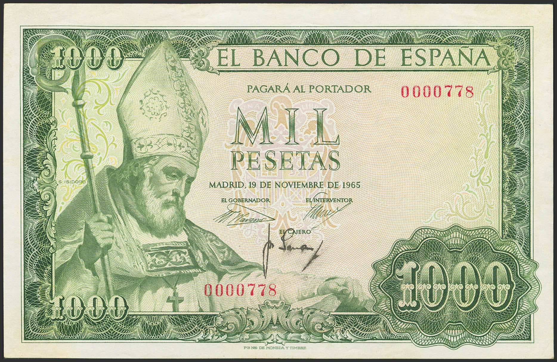 1000 Pesetas. 19 de Noviembre de 1965. Sin serie y numeración bajísima (0000778). (Edifil 2023: 471). EBC-.