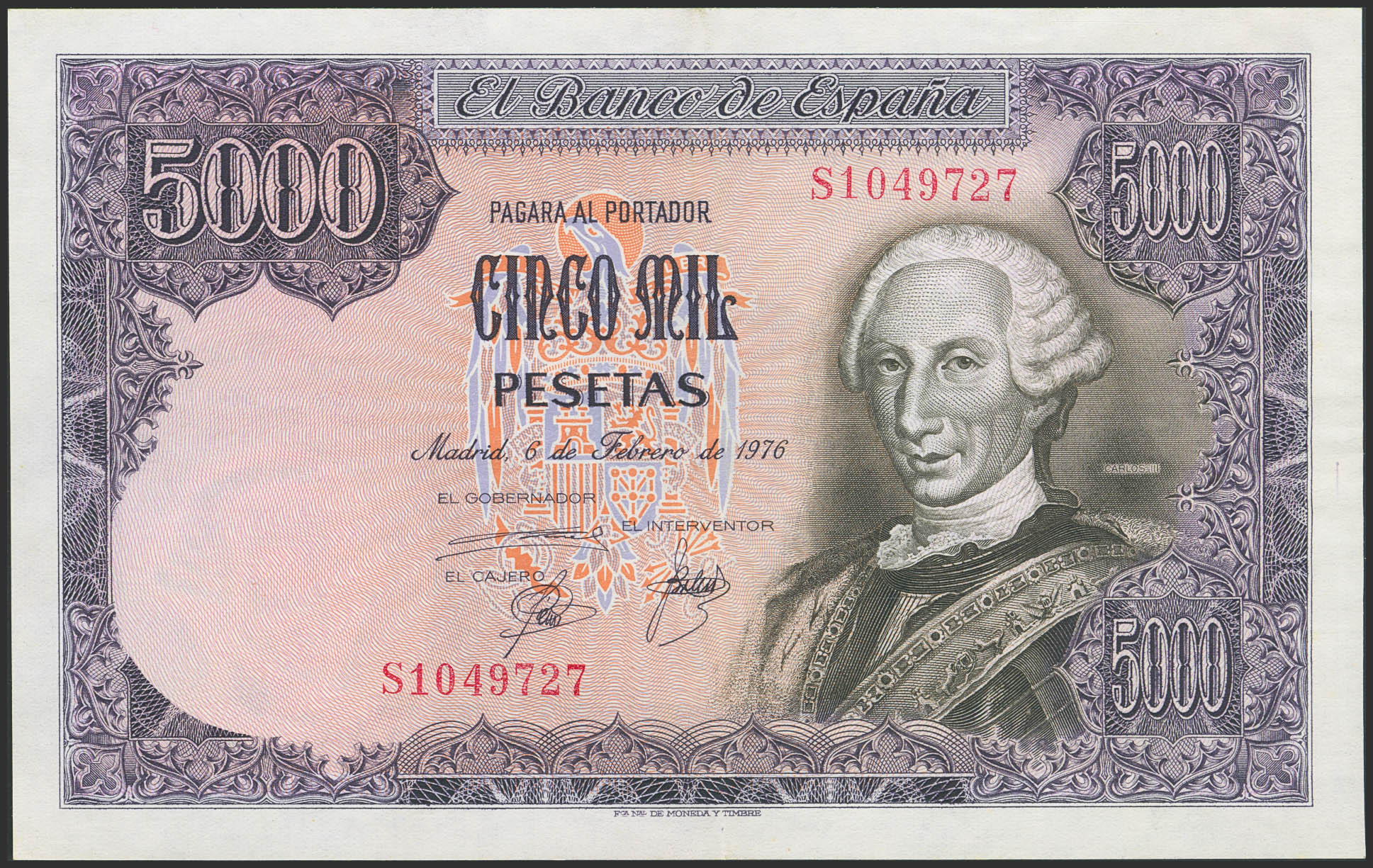5000 Pesetas. 6 de Febrero de 1976. Serie S. (Edifil 2023: 475a). Conserva gran parte del apresto original. EBC++.