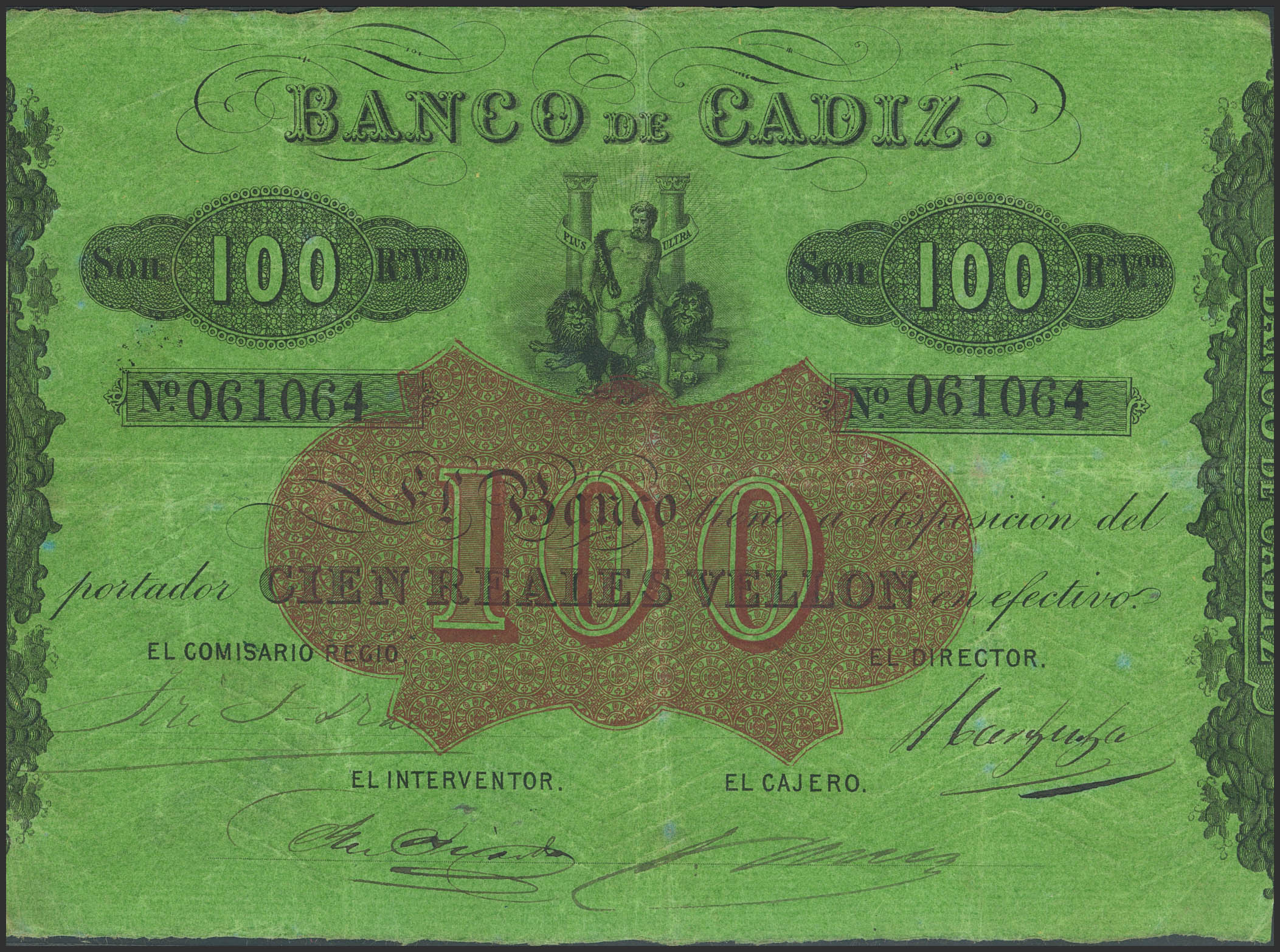 BANCO DE CADIZ. Emisión III. 100 Reales (sin fechar). Cuatro firmas y resello en seco. (Edifil 2023: 78). Raro. MBC+.