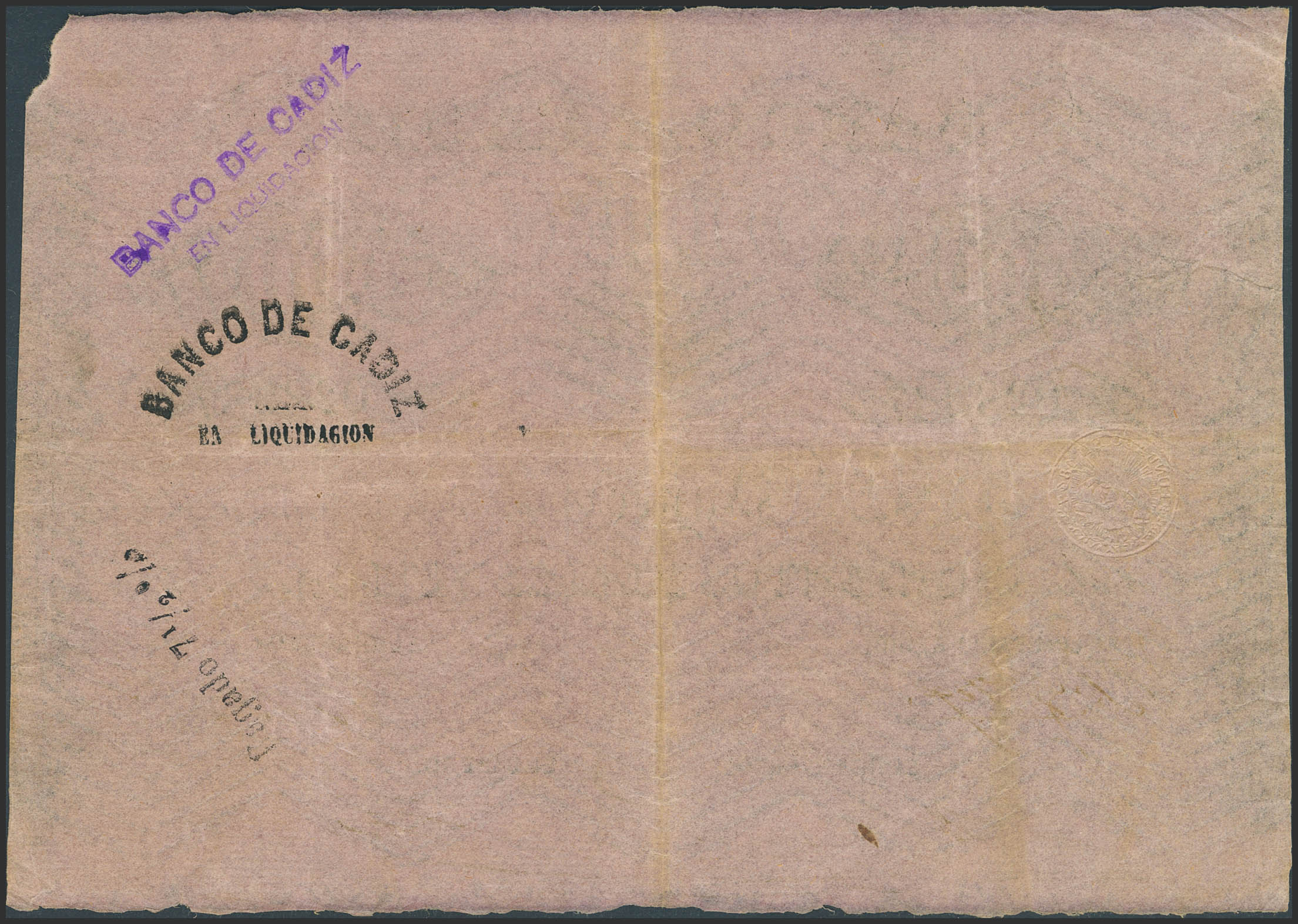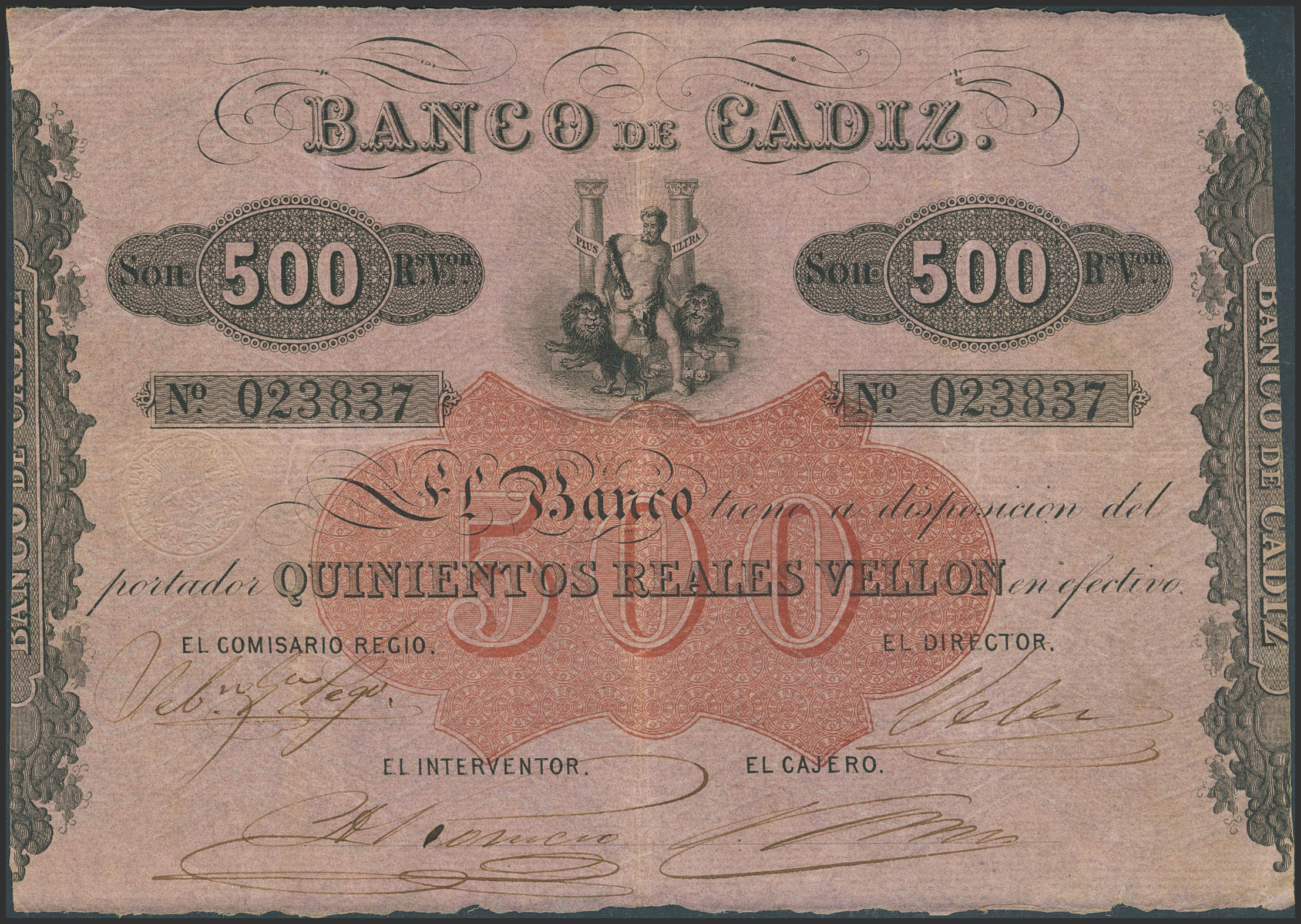 BANCO DE CADIZ. Emisión III. 500 Reales (sin fechar). Cuatro firmas y resello en seco. (Edifil 2023: 80). Raro. MBC.