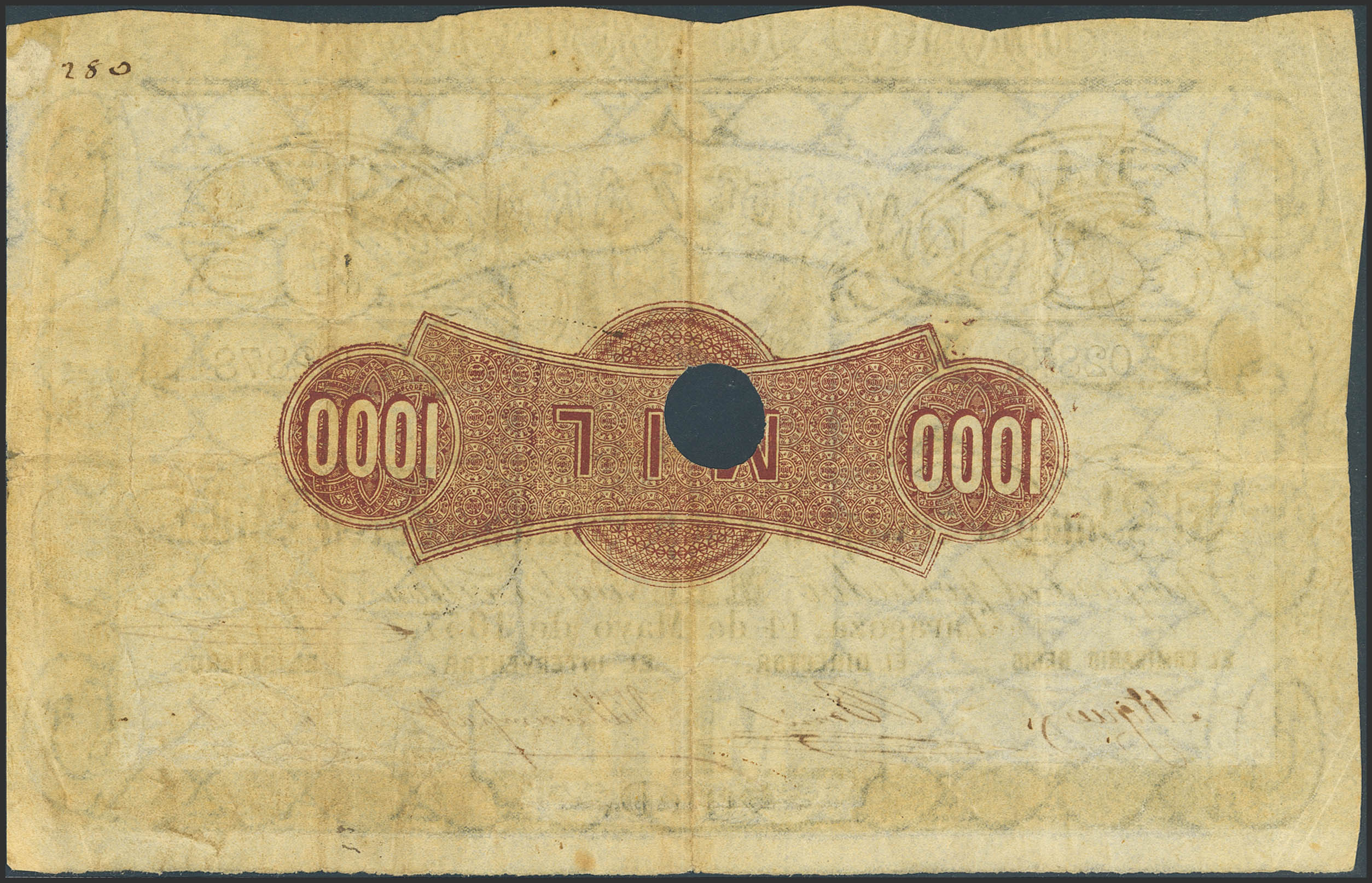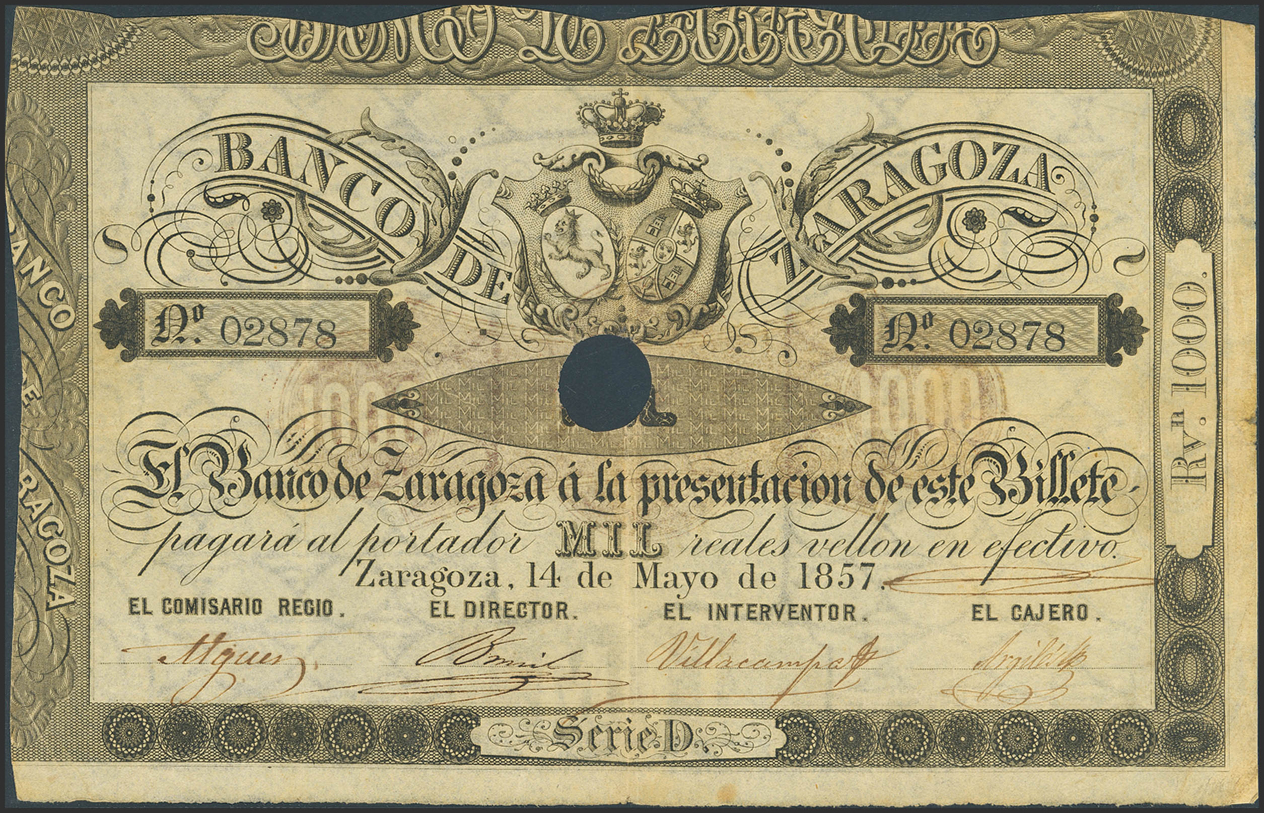 BANCO DE ZARAGOZA. 1000 Reales de Vellón. 4 de Mayo de 1857. Serie D, con taladro y con firmas. (Edifil 2023: 129A). Inusual. MBC+.