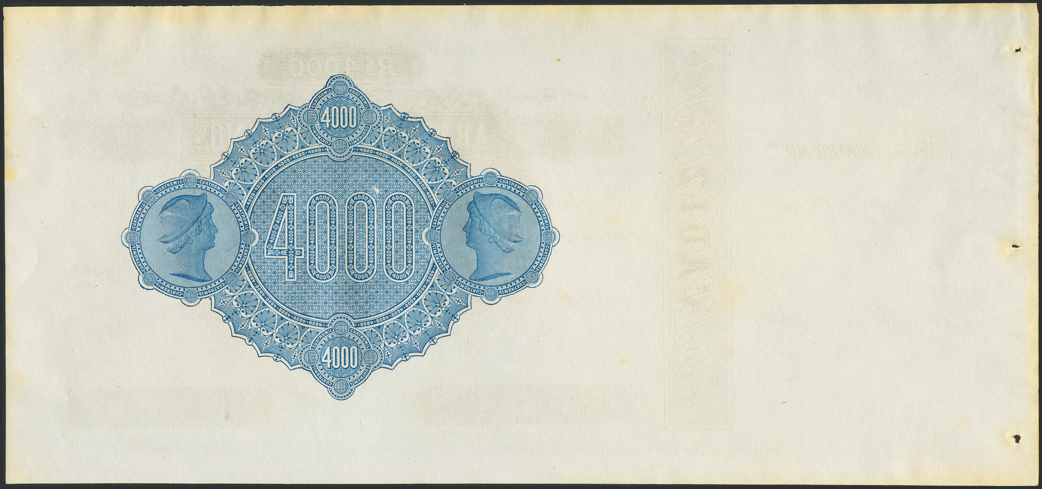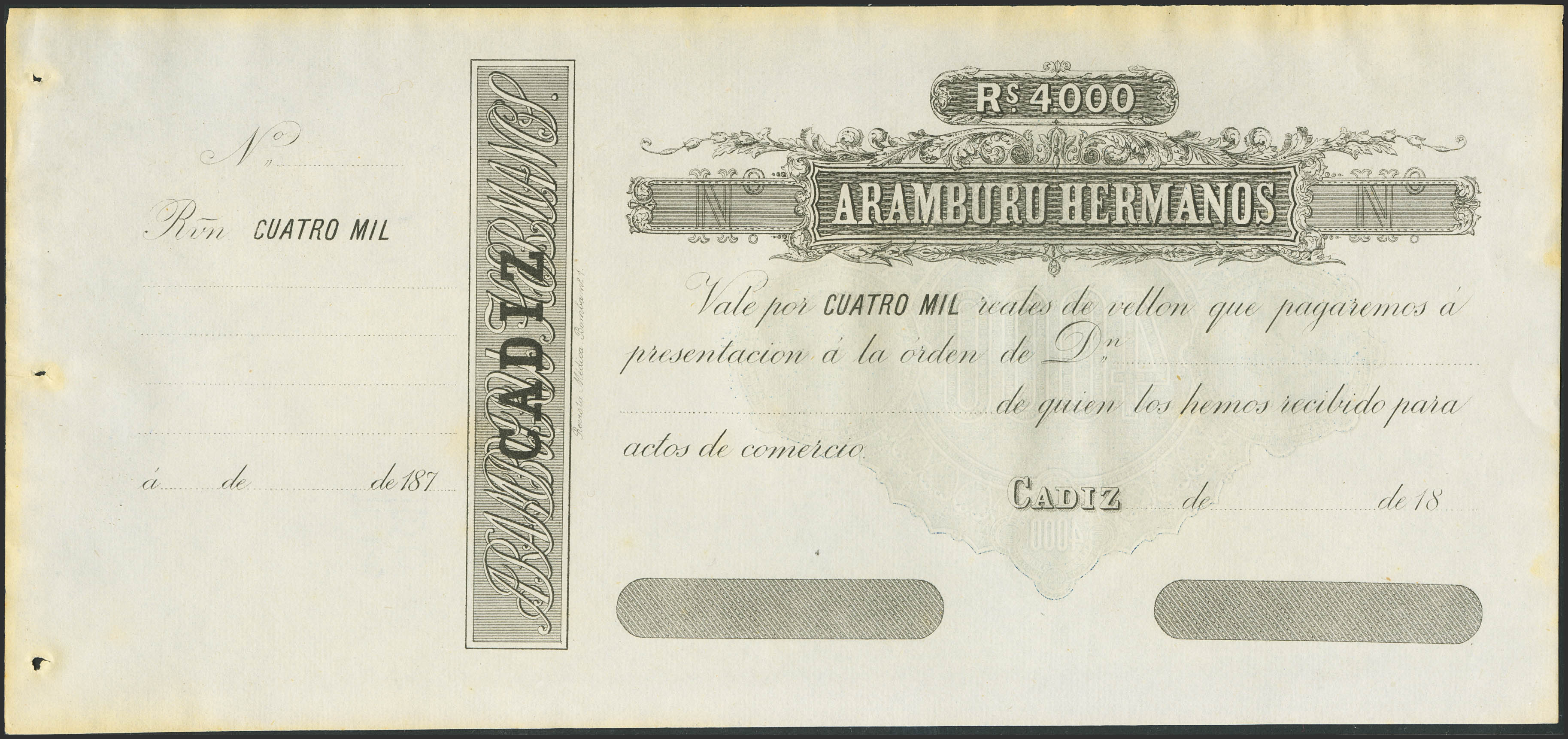 4000 Reales de Vellón. (18__ca). Aramburu Hermanos, Cádiz (matriz a la izquierda). Ligeramente tonalizado en los bordes. SC--. Para entender mejor la contextualización de este billete recomendamos la obra "Obligaciones, vales y documentos puestos en circulación como papel moneda en España", de Don Ramón Cobo Huici.