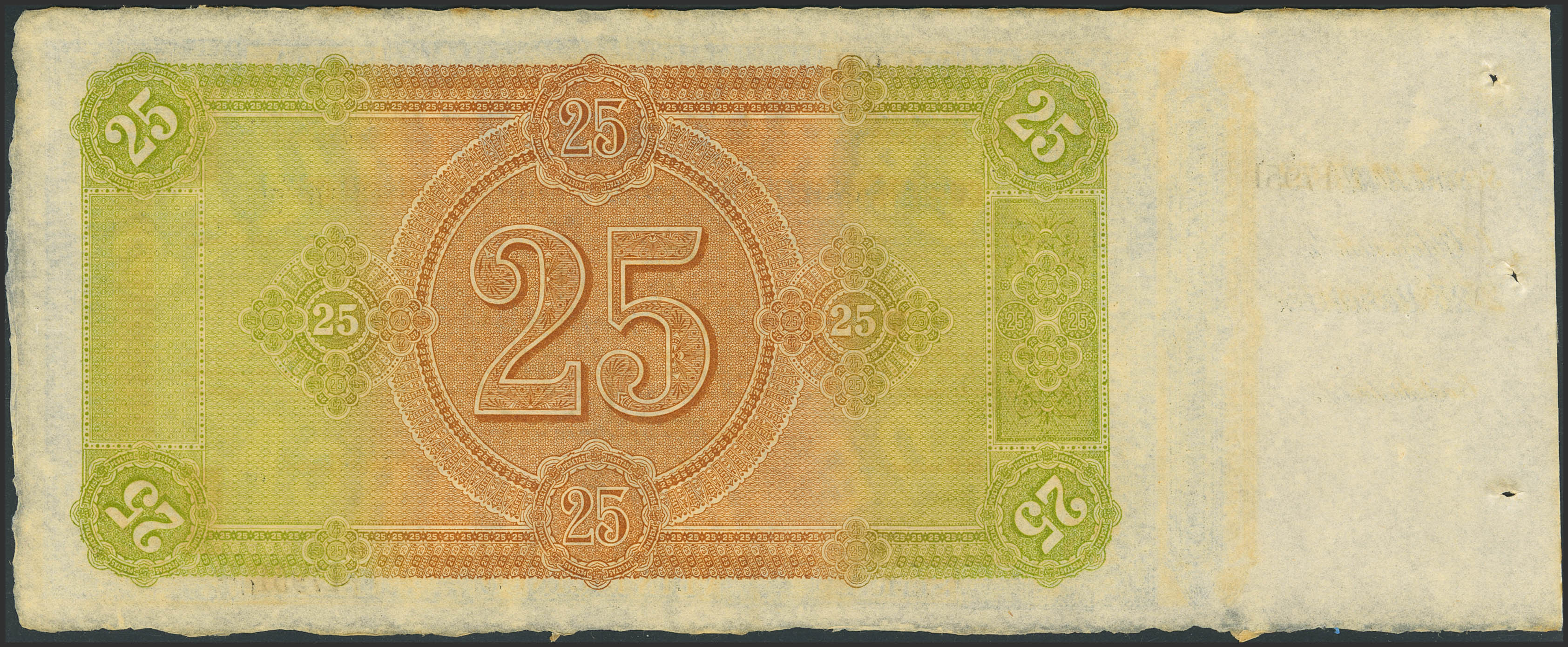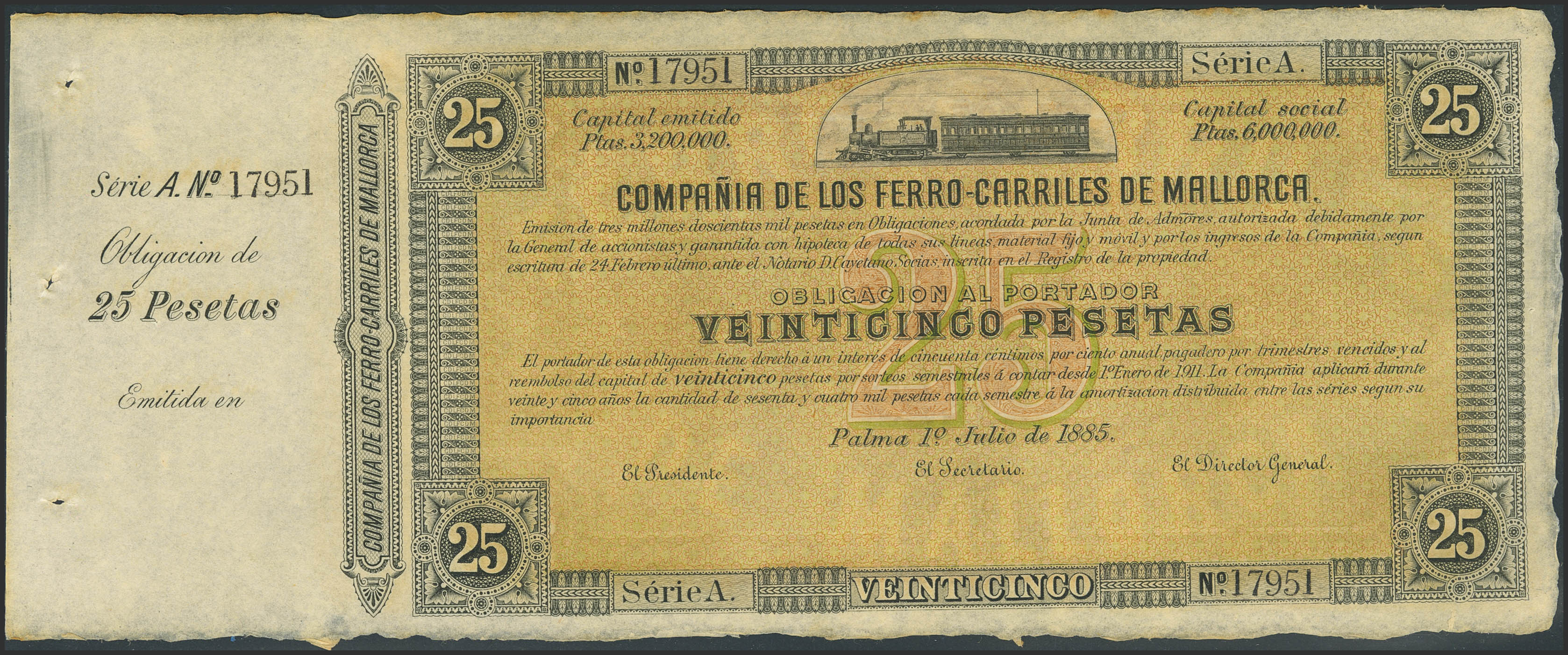 25 Pesetas. 1 de Julio de 1885. Compañía de los Ferrocarriles (Mallorca). Serie A y matriz a la izquierda. Para entender mejor la contextualización de este billete recomendamos la obra "Obligaciones, vales y documentos puestos en circulación como papel moneda en España", de Don Ramón Cobo Huici. SC-