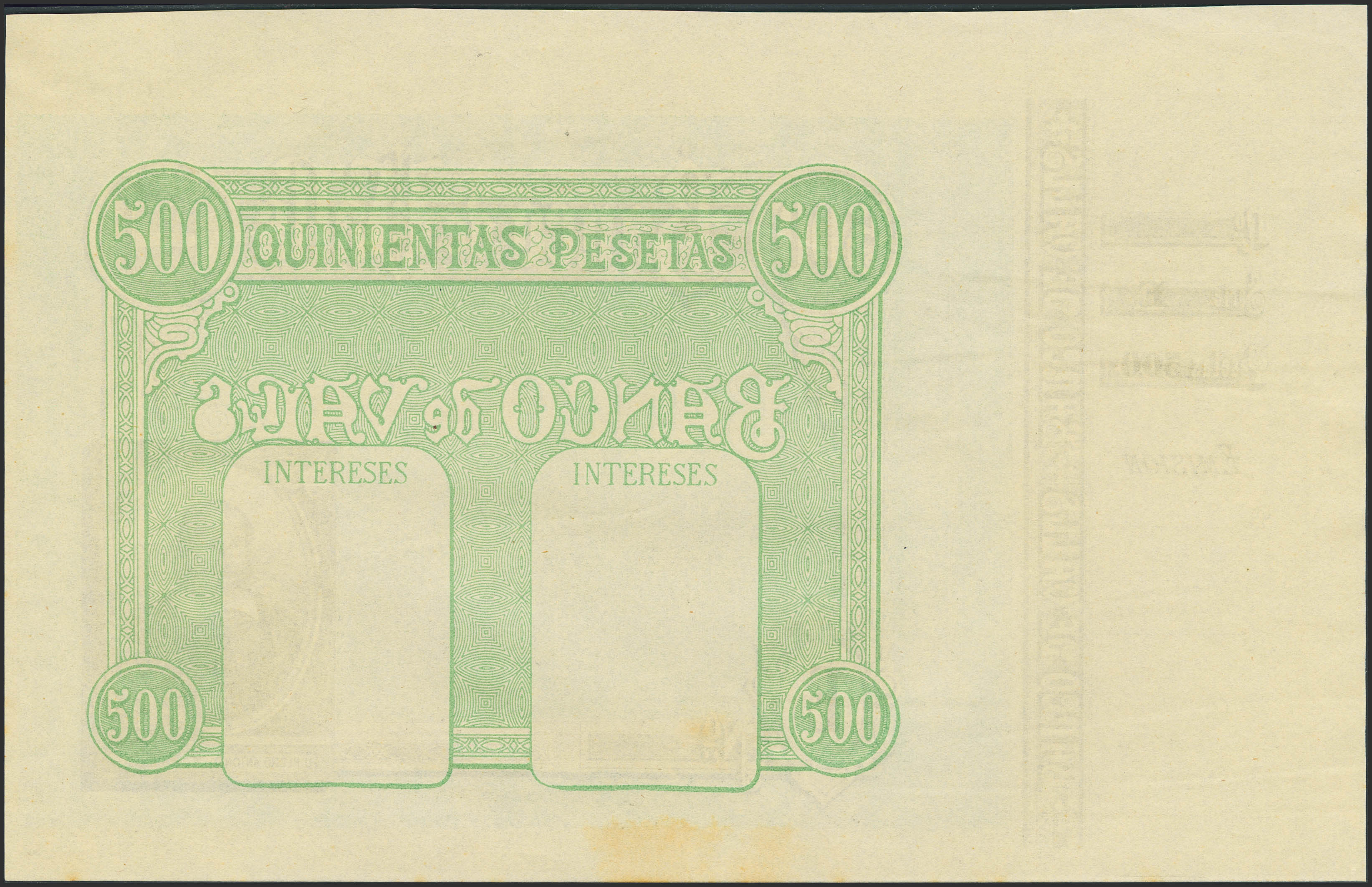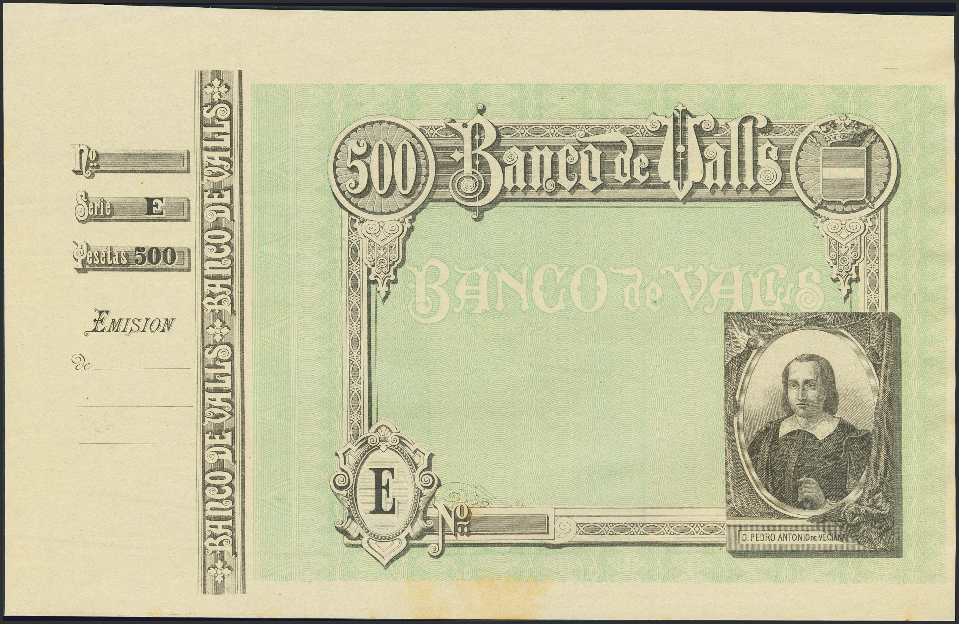 500 Pesetas. (1892ca). Banco de Valls. Prueba de impresión, con matriz a la izquierda y sin texto. Serie E. (Ruiz y Alentorn: 934). Manchita del tiempo. SC-.