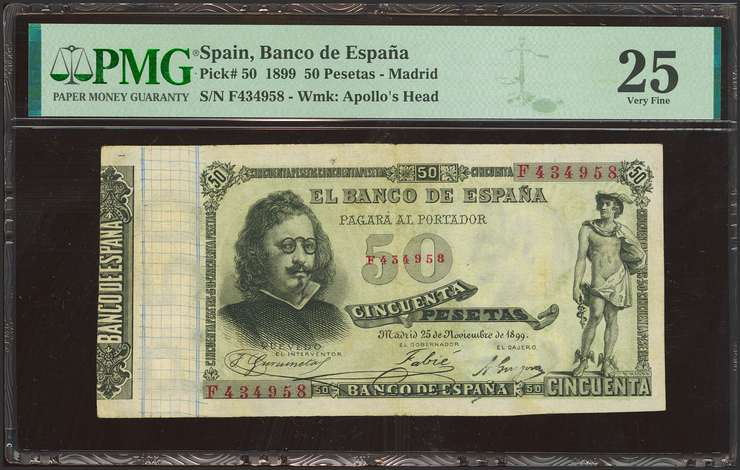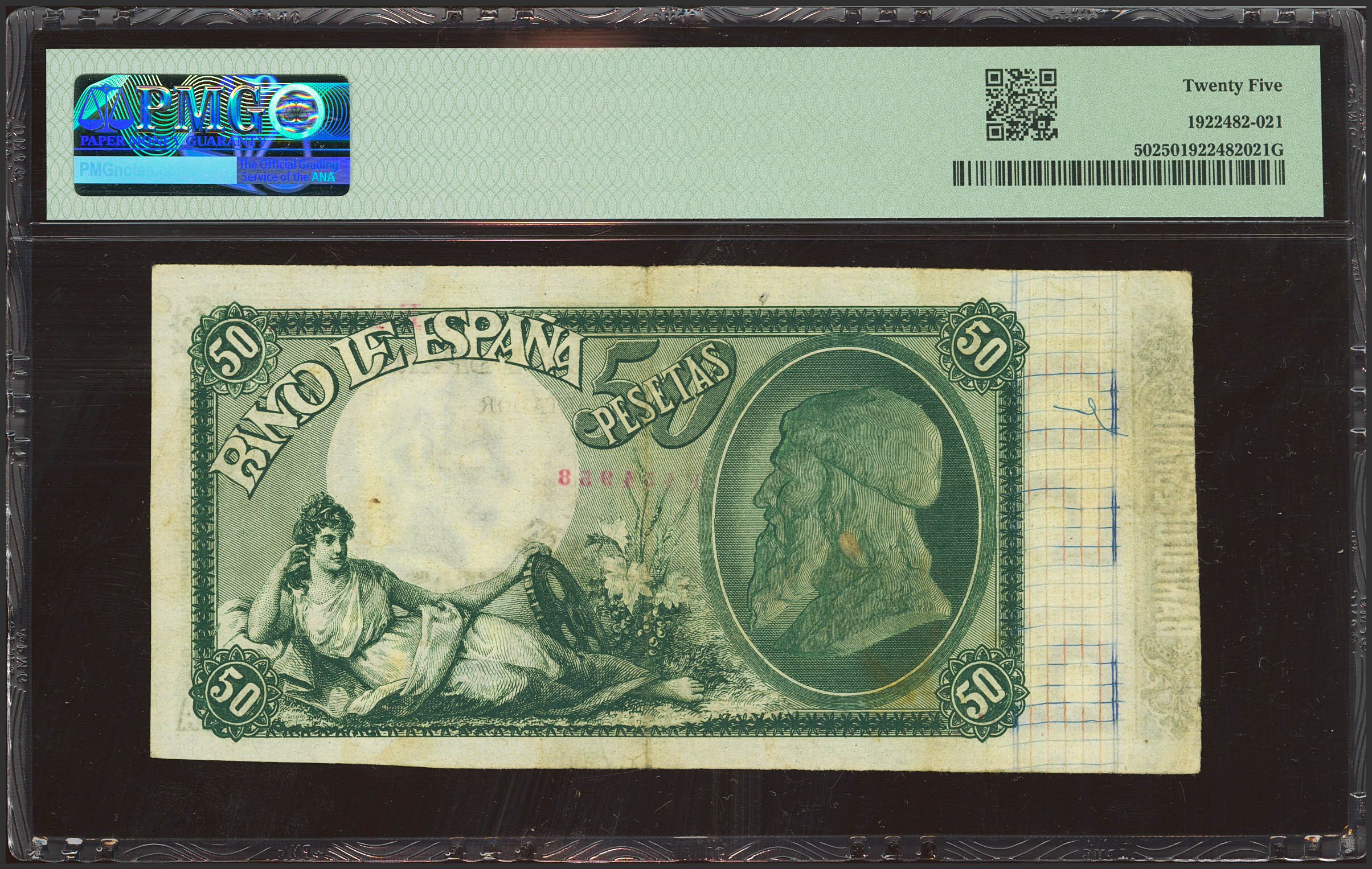 50 Pesetas. 25 de Noviembre de 1899. Serie F. (Edifil 2023: 307a, Pick: 50). Raro en esta conservación, especialmente sin ningún tipo de reparaciones. MBC+. Encapsulado PMG25.