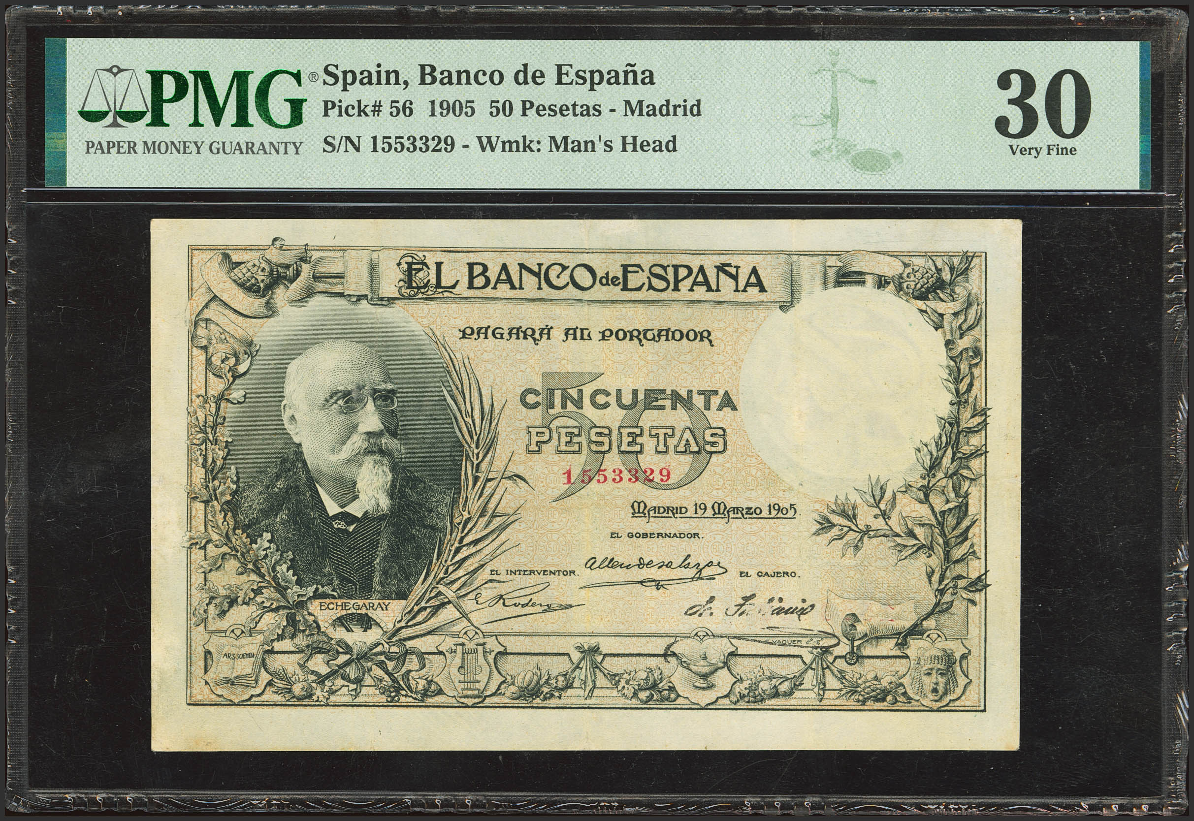 50 Pesetas. 19 de Marzo de 1905. Sin serie. (Edifil 2023: 312, Pick: 56). Raro, mínimamente reparado. MBC+. Encapsulado PMG30 (minor restoration).