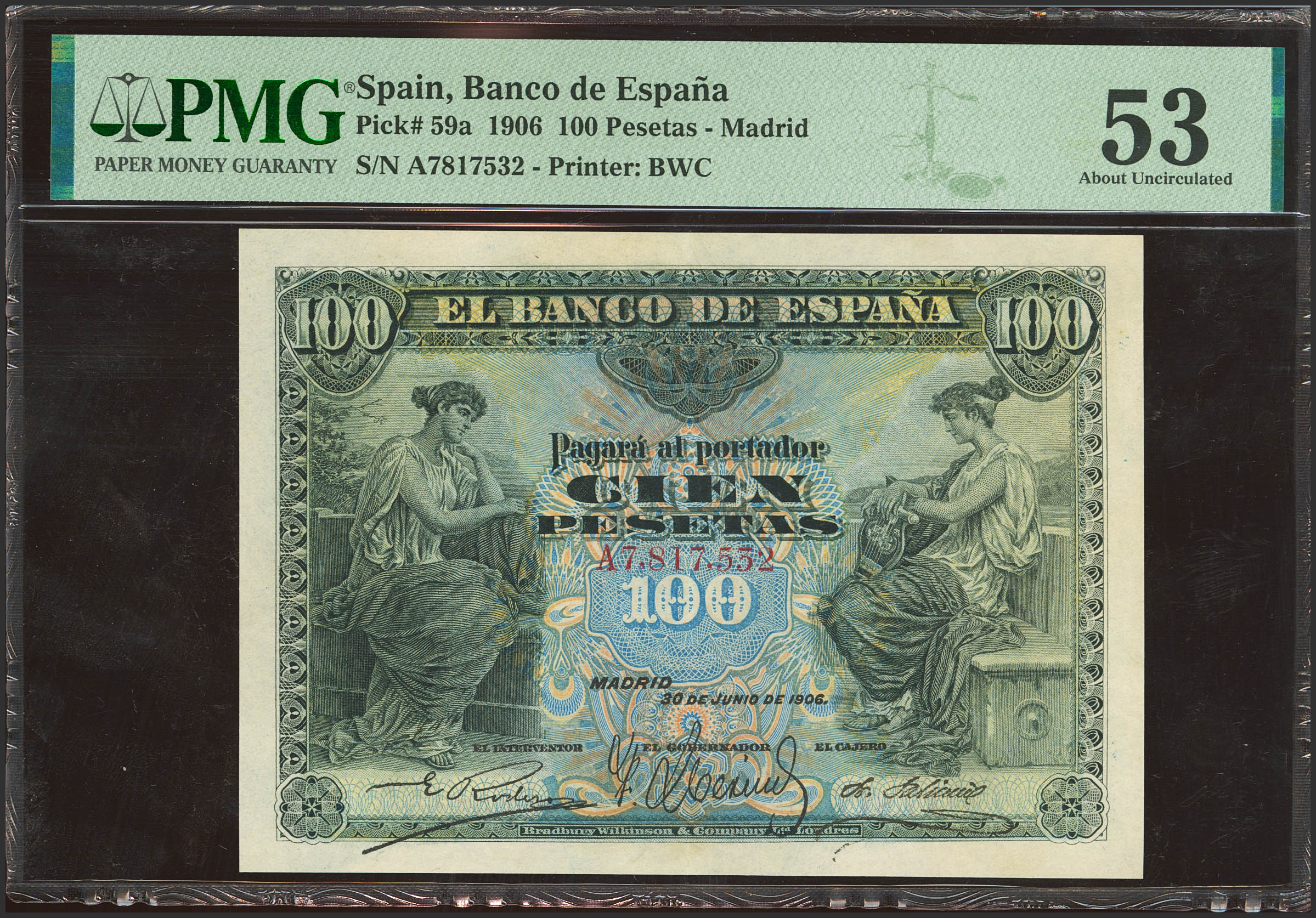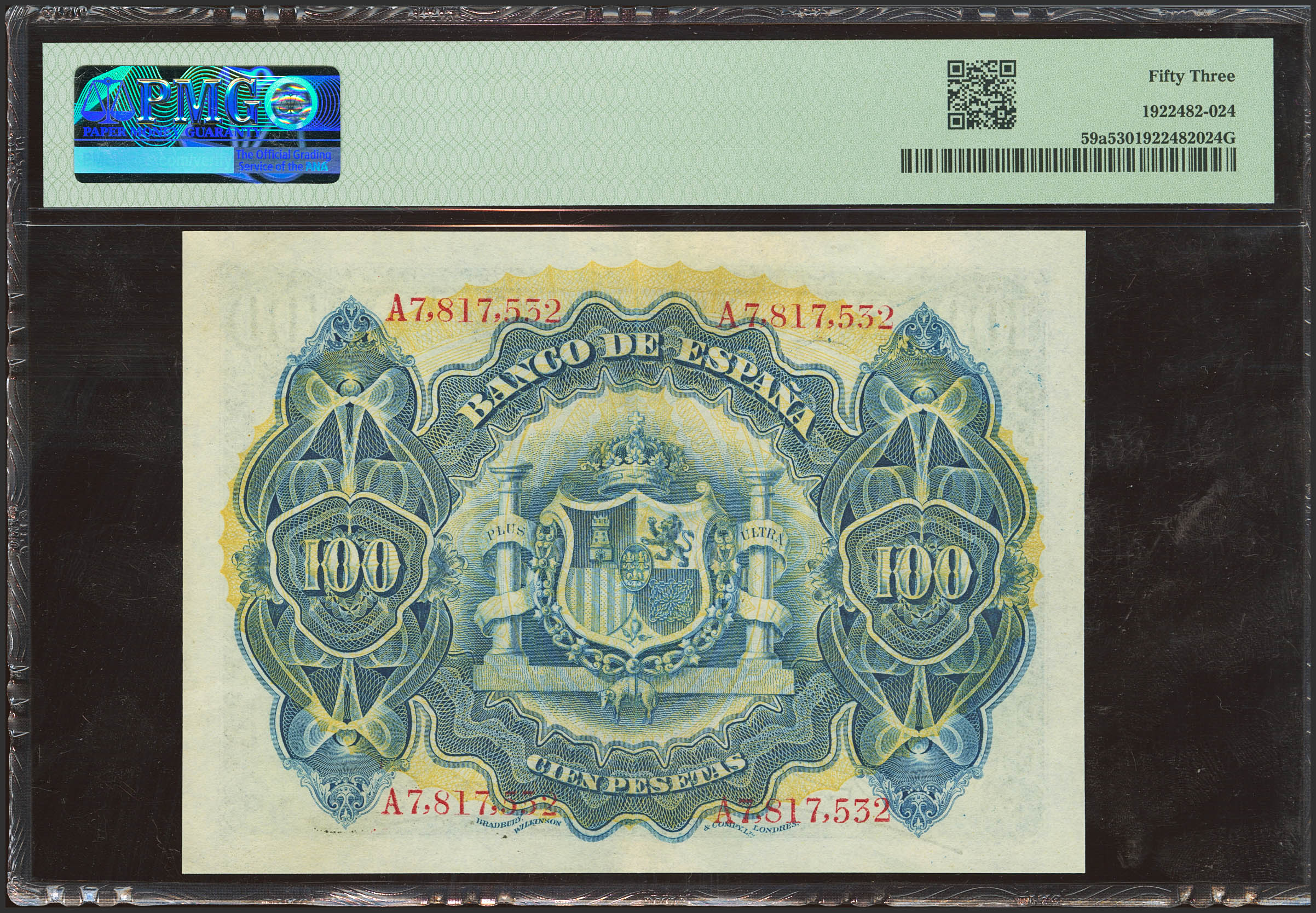 100 Pesetas. 30 de Junio de 1906. Serie A. (Edifil 2023: 313a, Pick: 59a). Raro en esta calidad. EBC++. Encapsulado PMG55.