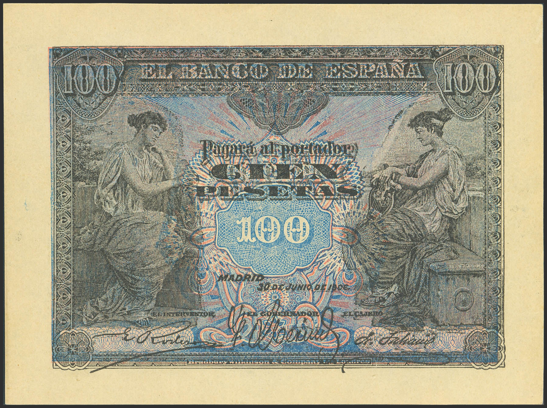 100 Pesetas. 30 de Junio de 1906. Falso Epoca. Sin serie. (Edifil 2023: 313F, Cobo: 32). Muy raro, con los márgenes sin ajustar "recién salido de imprenta". SC-.