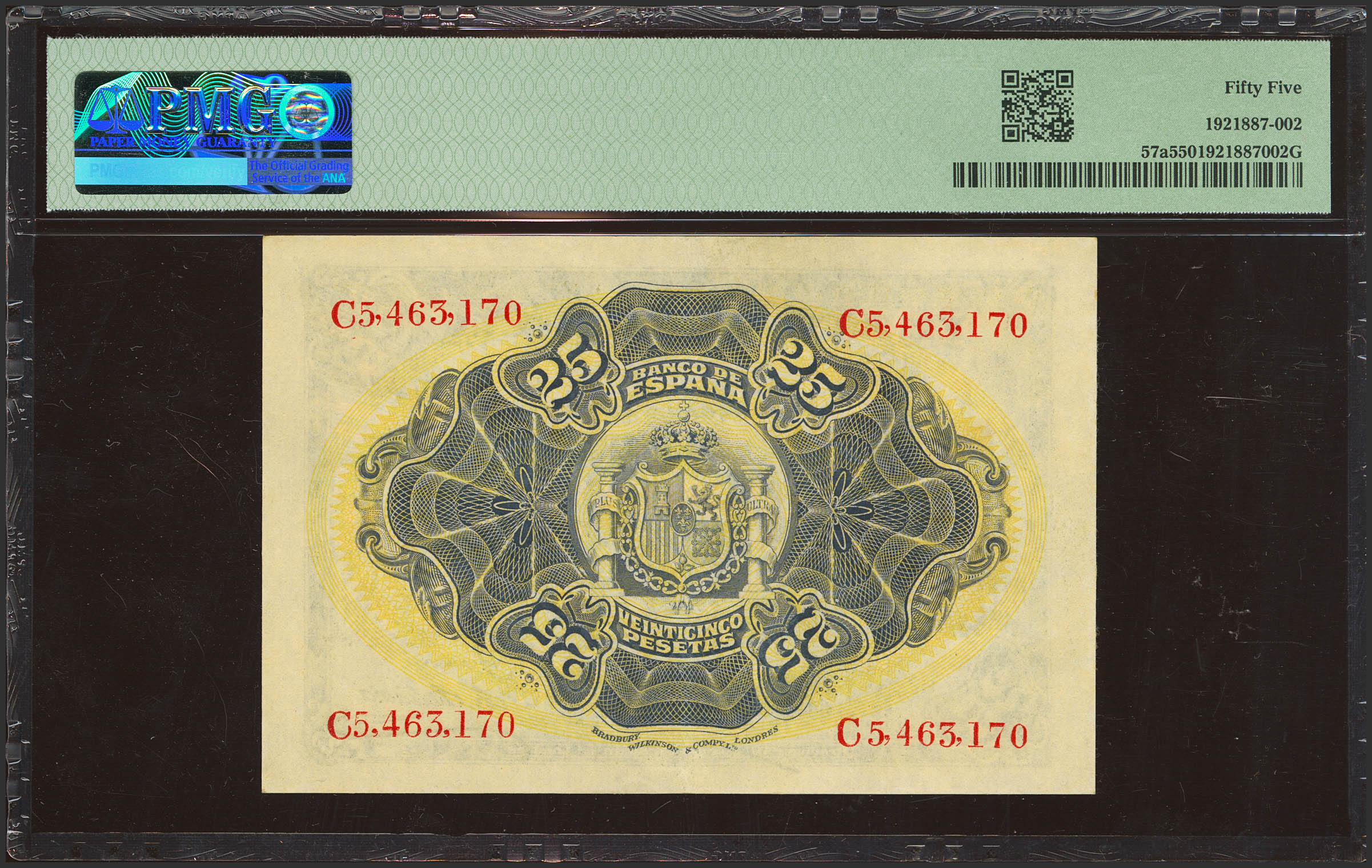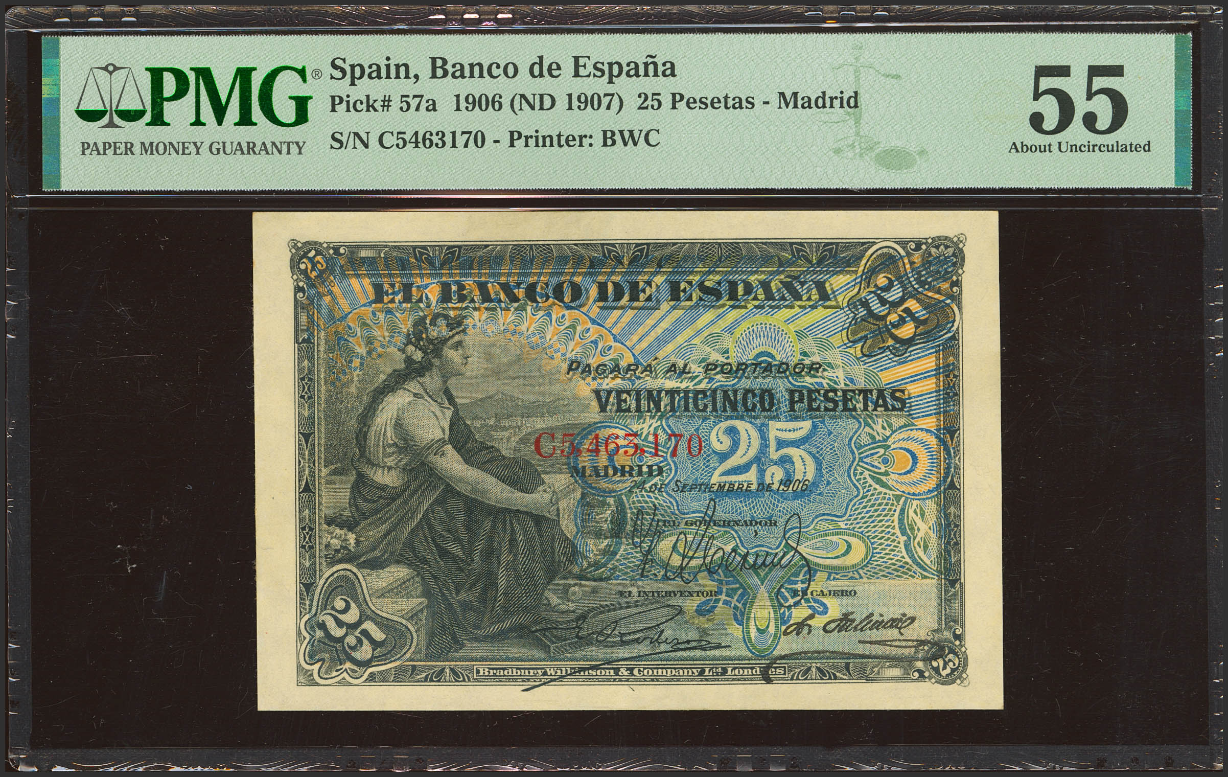25 Pesetas. 24 de Septiembre de 1906. Serie C. (Edifil 2023: 314a, Pick: 57a). Inusual en esta calidad. EBC+. Encapsulado PMG55.