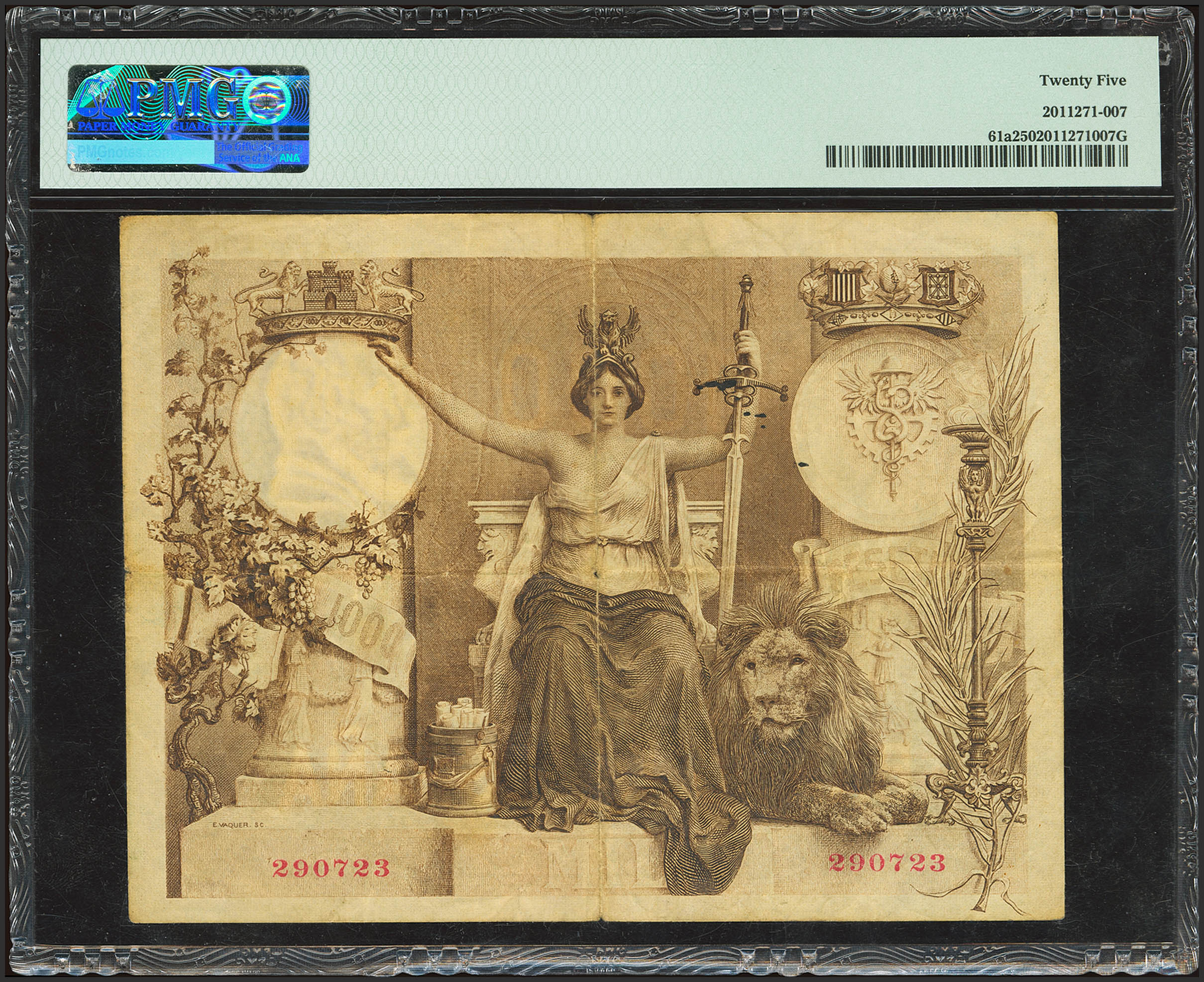 1000 Pesetas. 10 de Mayo de 1907. Sin serie. (Edifil 2023: 317, Pick: 61a). Raro, especialmente sin ninguna reparación. MBC. Encapsulado PMG25.
