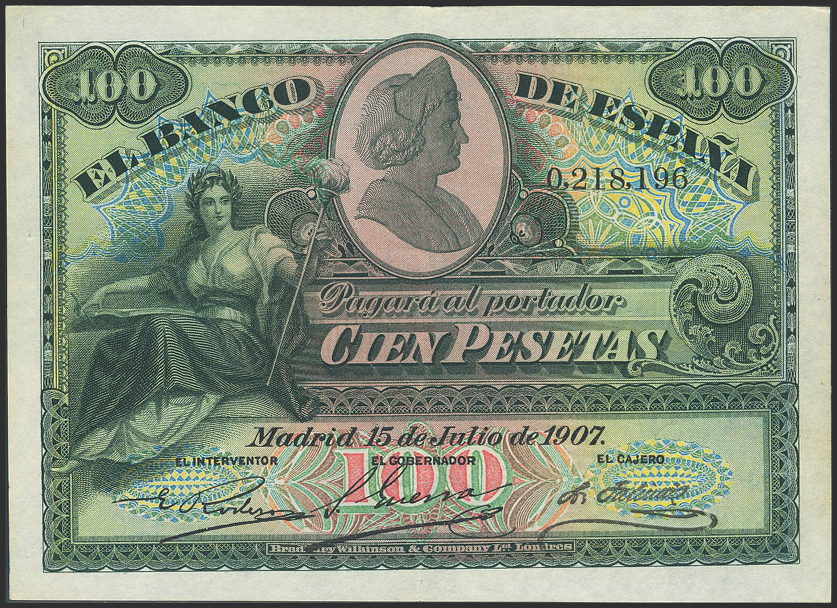 100 Pesetas. 15 de Julio de 1907. Sin serie. (Edifil 2023: 320). Conserva gran parte de su apresto original. EBC.