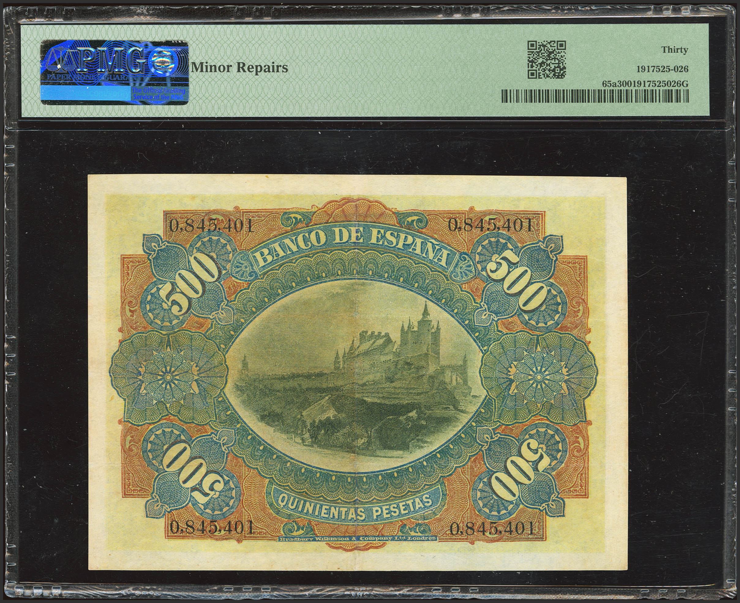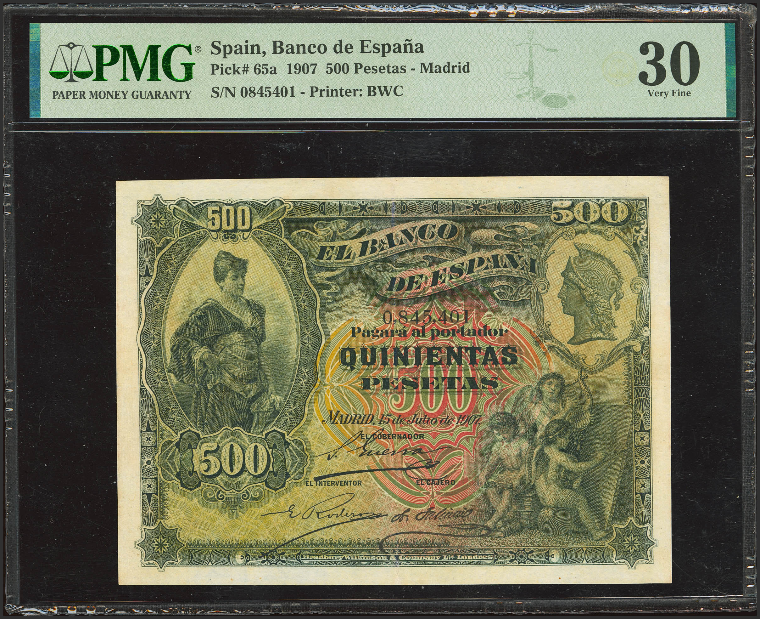 500 Pesetas. 15 de Julio de 1907. Sin serie. (Edifil 2023: 321, Pick: 65a). Raro, mínimamente reparado. MBC+. Encapsulado PMG30 (minor repairs).