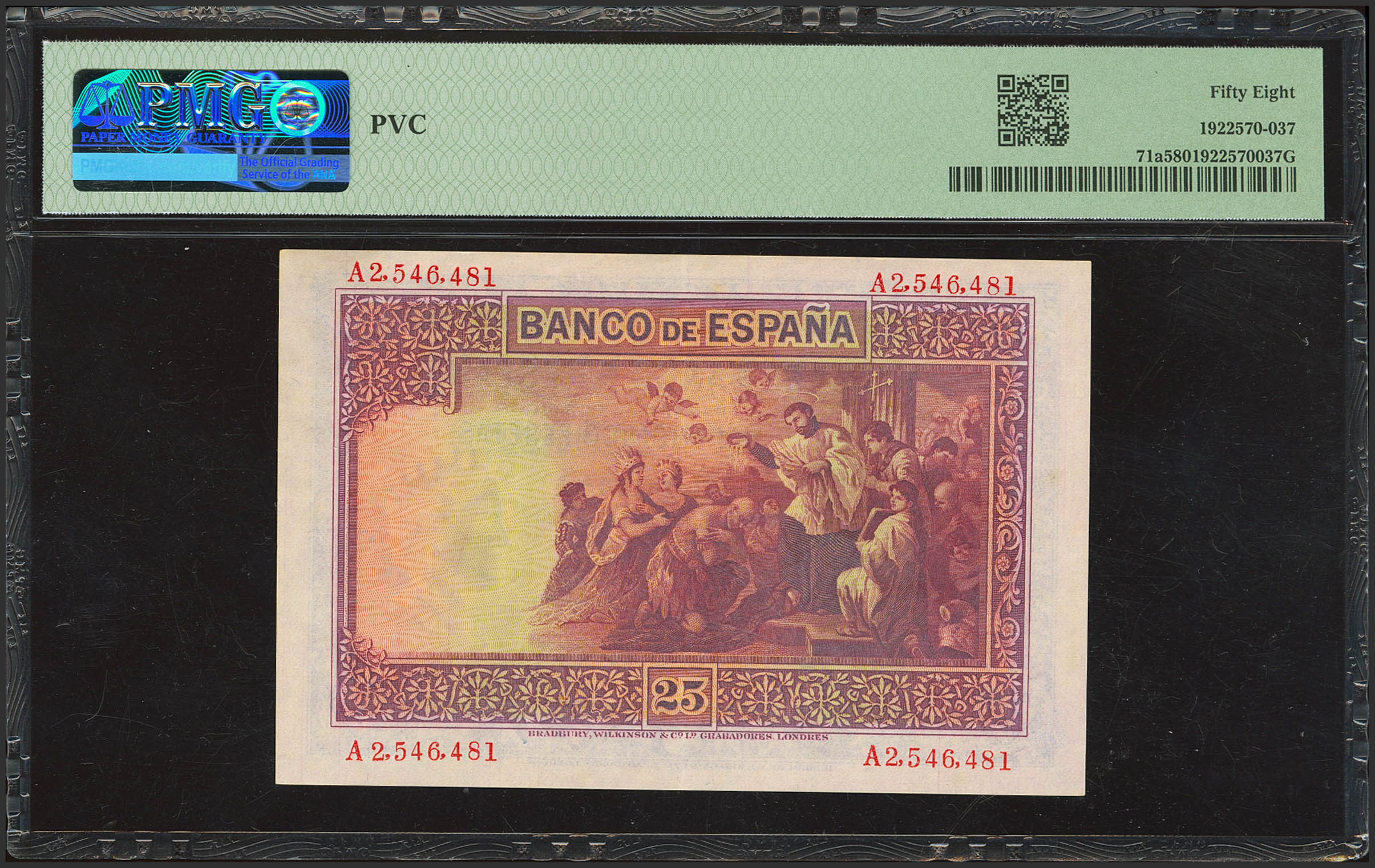 25 Pesetas. 12 de Octubre de 1926. Serie A. (Edifil 2023: 325a, Pick: 71a). Inusual en esta calidad. EBC++. Encapsulado PMG58 (PVC).