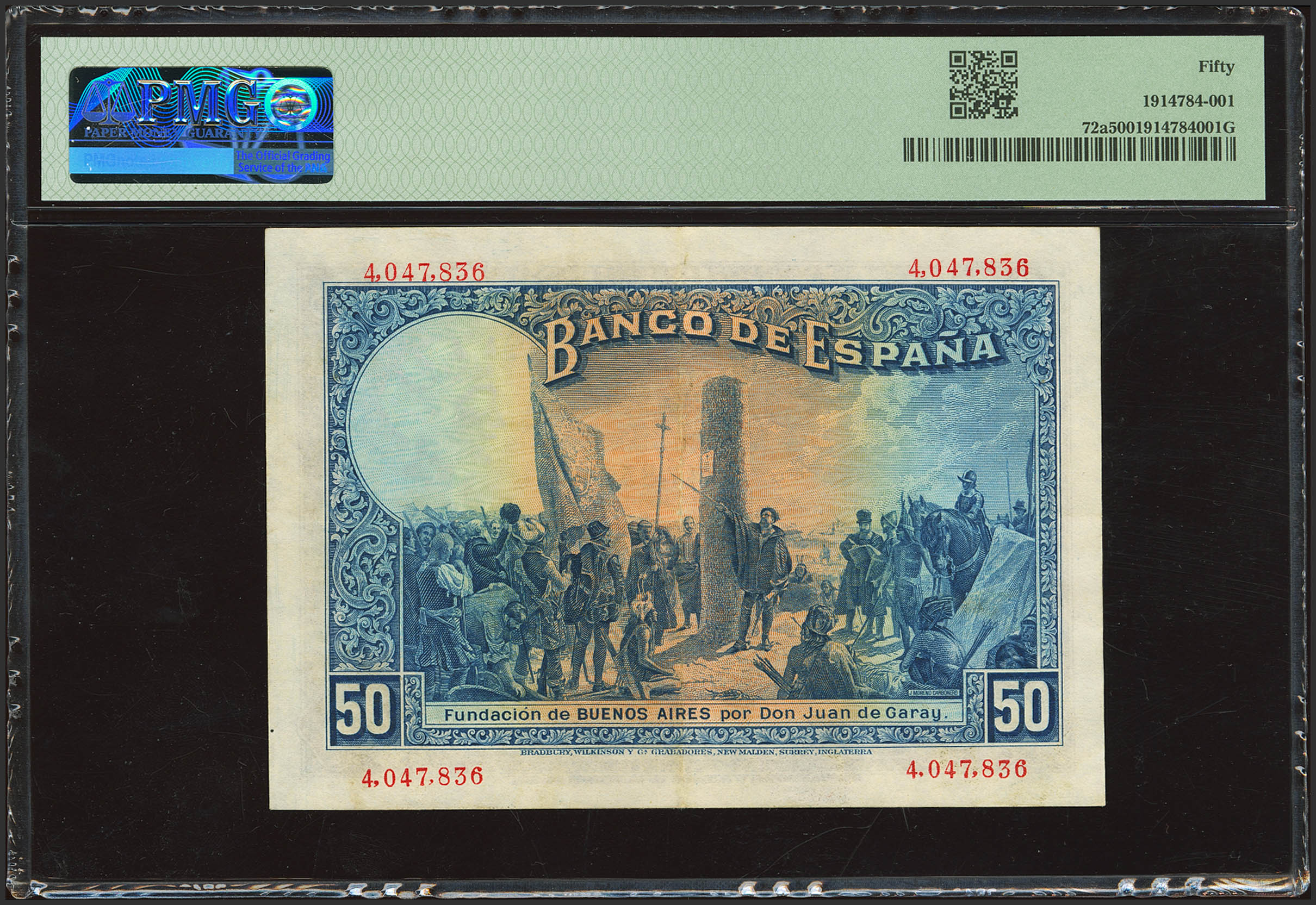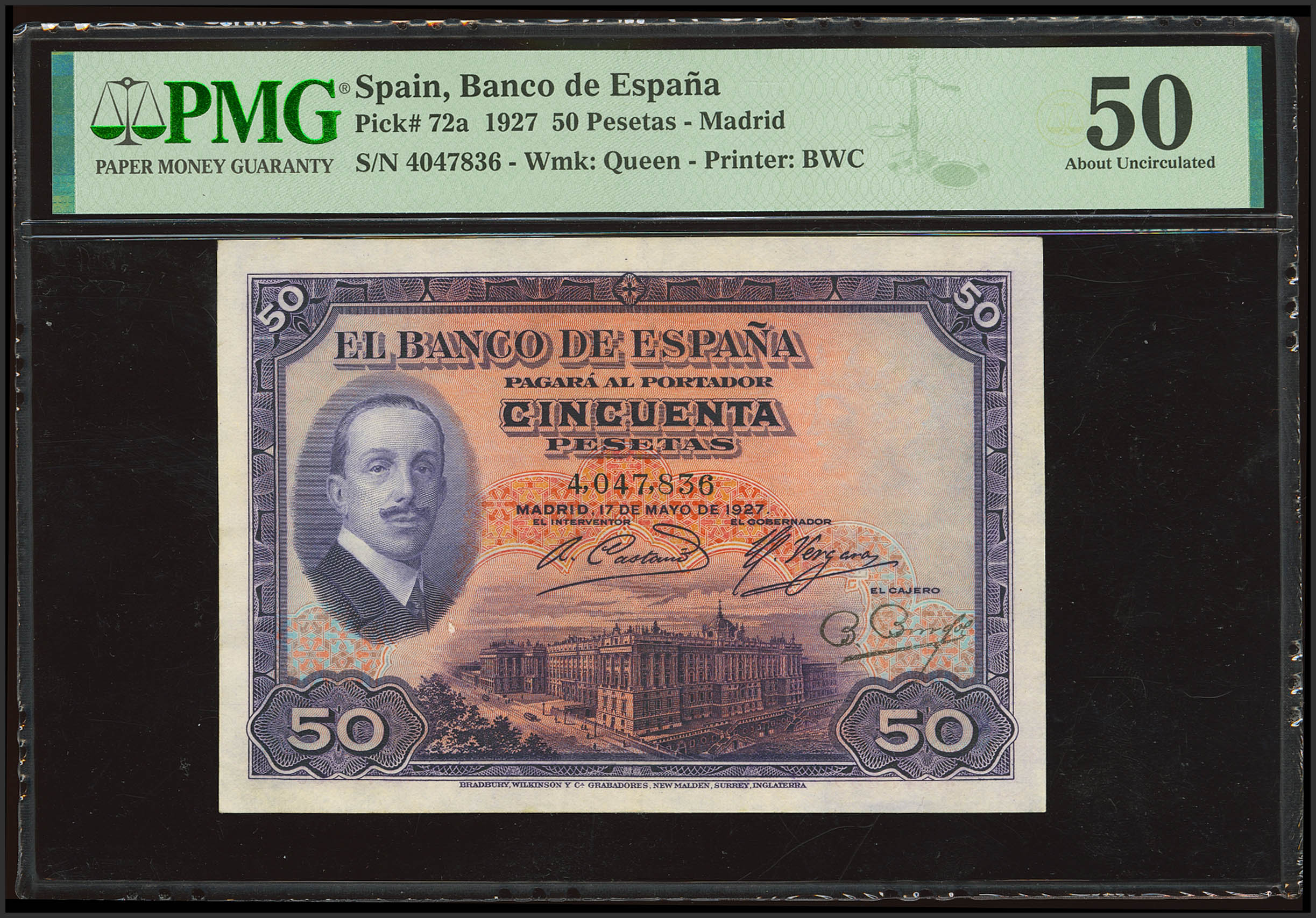 50 Pesetas. 17 de Mayo de 1927. Sin serie. (Edifil 2023: 326, Pick: 72a). Raro. EBC. Encapsulado PMG50.