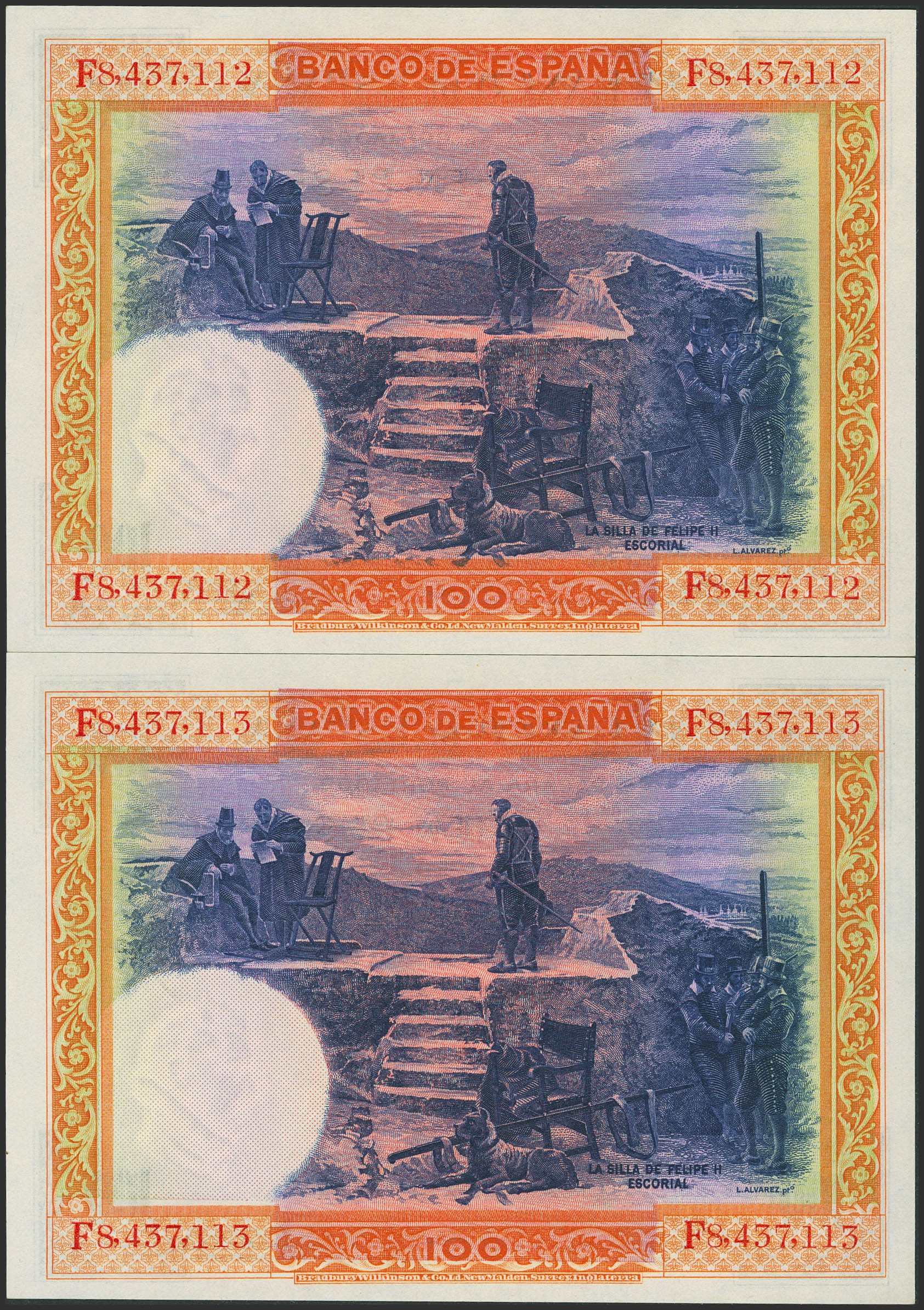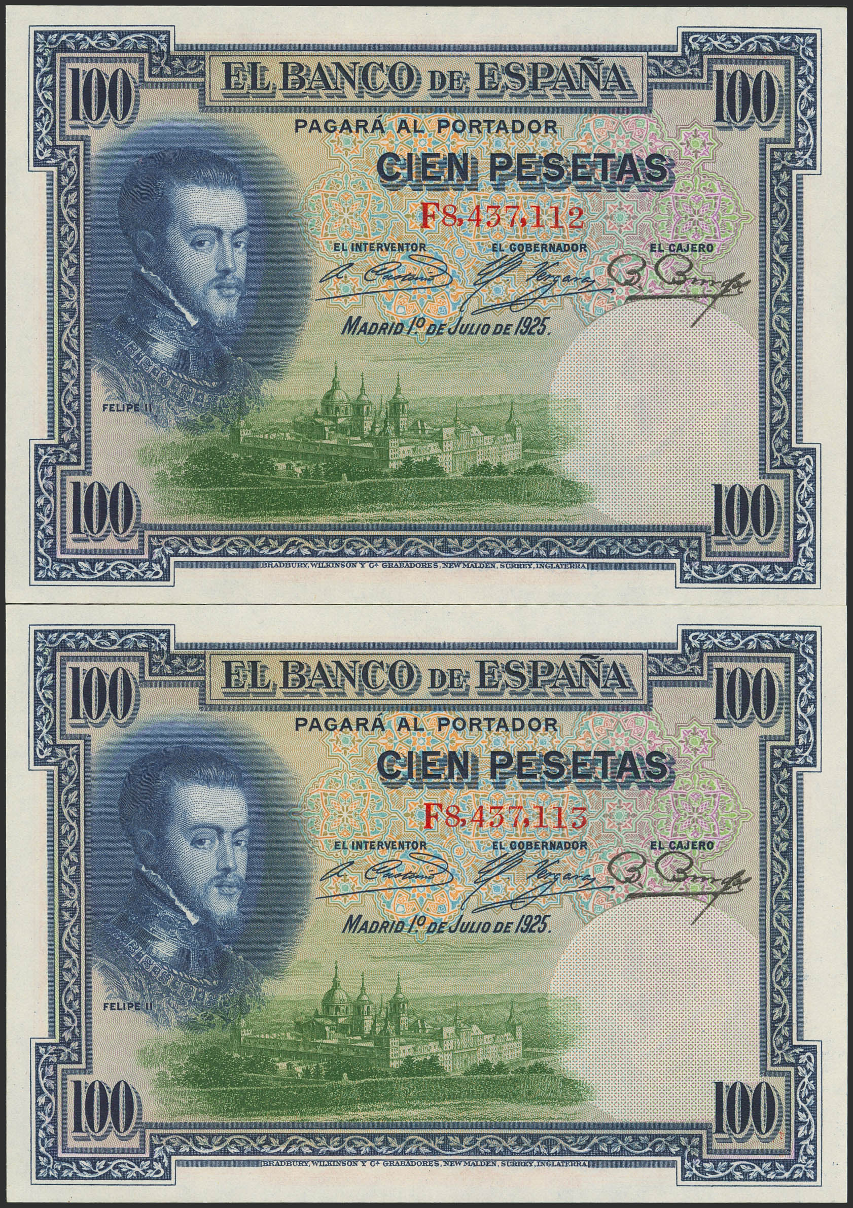 100 Pesetas. 1 de Julio de 1925. Pareja correlativa. Serie F. (Edifil 2023: 350). Apresto original. SC.
