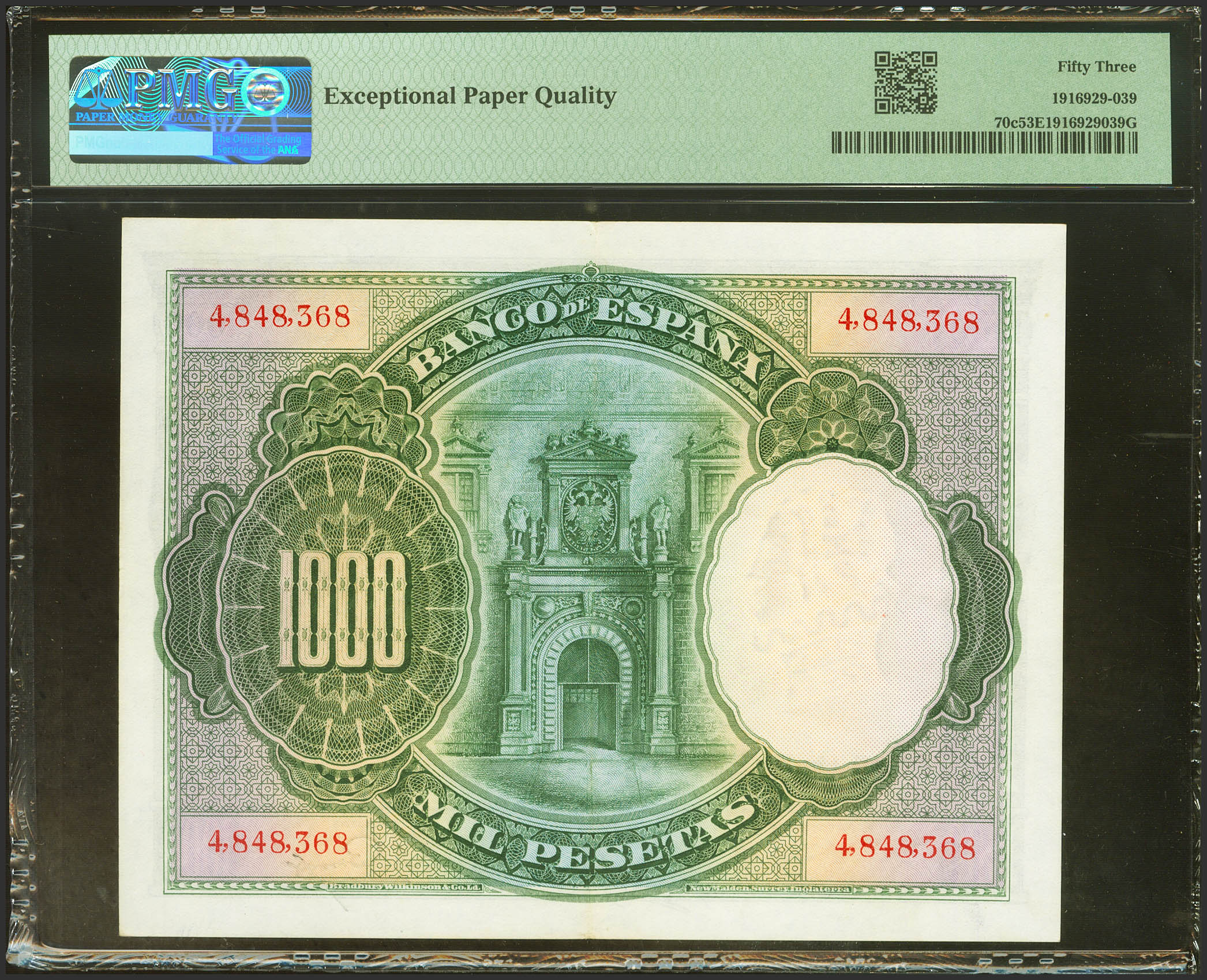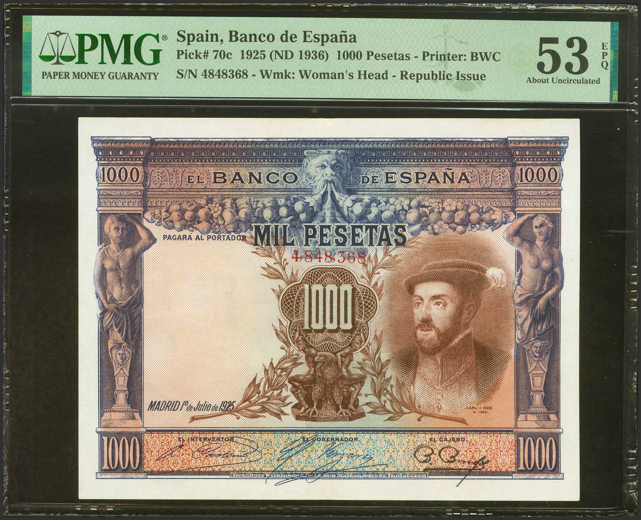 1000 Pesetas. 1 de Julio de 1925. Sin serie y numeración posterior al 3646000. (Edifil 2021: 351, Pick: 70c). Inusual en esta calidad, apresto original. EBC+. Encapsulado PMG53EPQ.