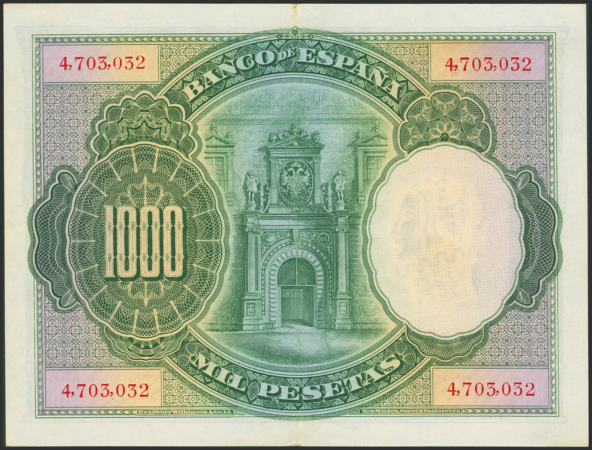 1000 Pesetas. 1 de Julio de 1925. Sin serie y numeración posterior a 3646000. (Edifil 2023: 351). EBC.