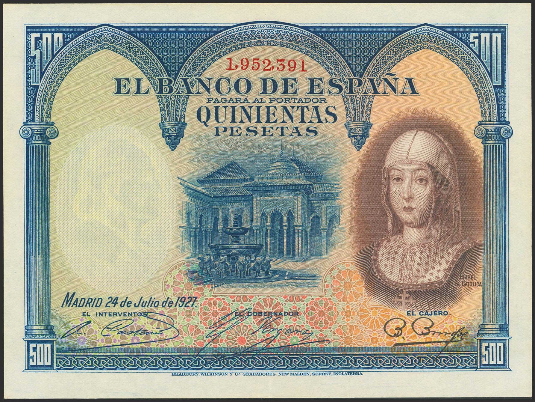 500 Pesetas. 24 de Julio de 1927. Sin serie y numeración posterior a 1602000. (Edifil 2023: 352). Presenta parte de su apresto original. EBC+.