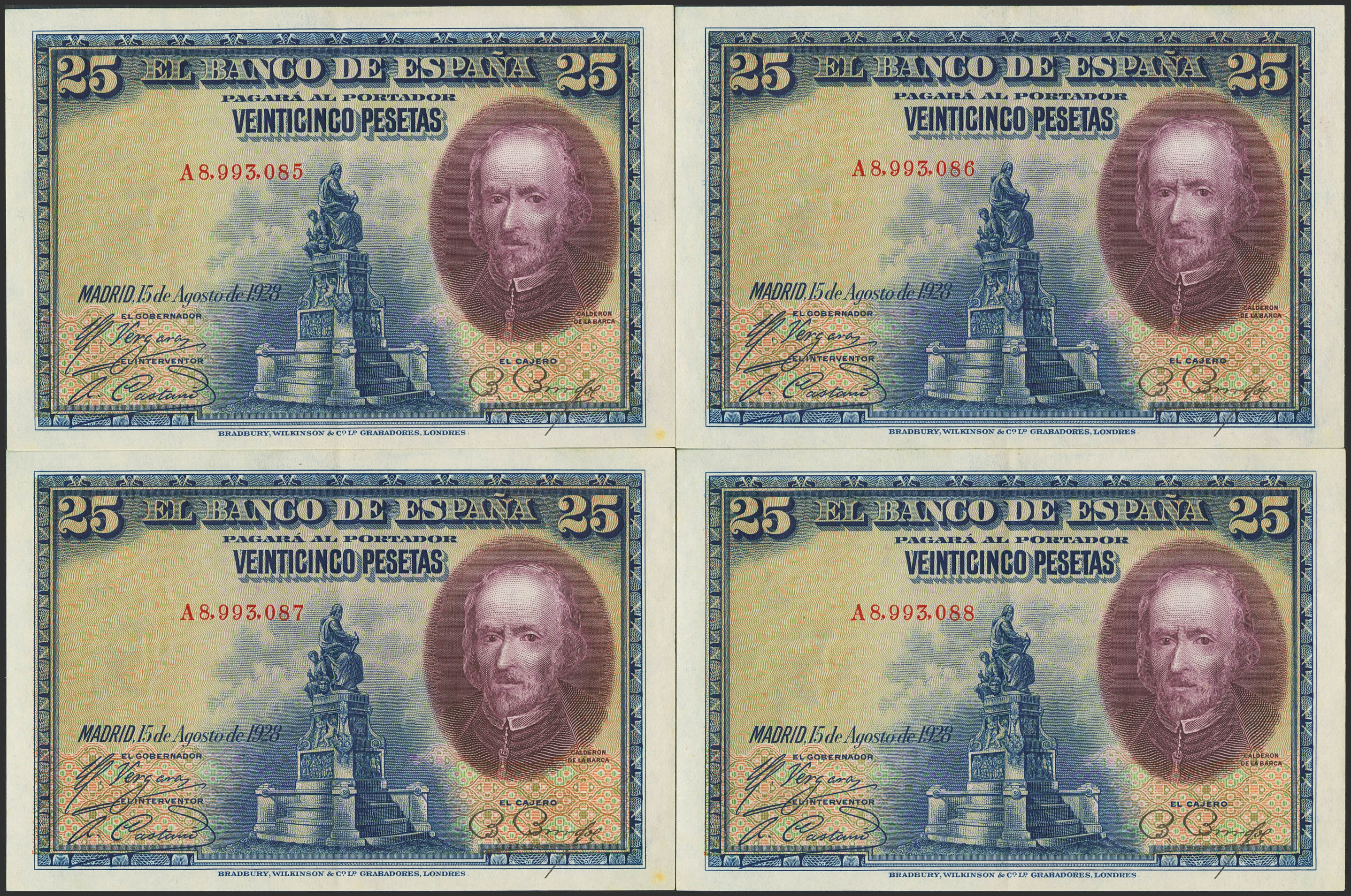 Conjunto de 4 billetes correlativos del 25 Pesetas, emitido el 15 de Agosto de 1928, todos ellos con la serie A y numeracón posterior a 7780000. (Edifil 2023: 353). Conservan gran parte de su apresto original. EBC++.
