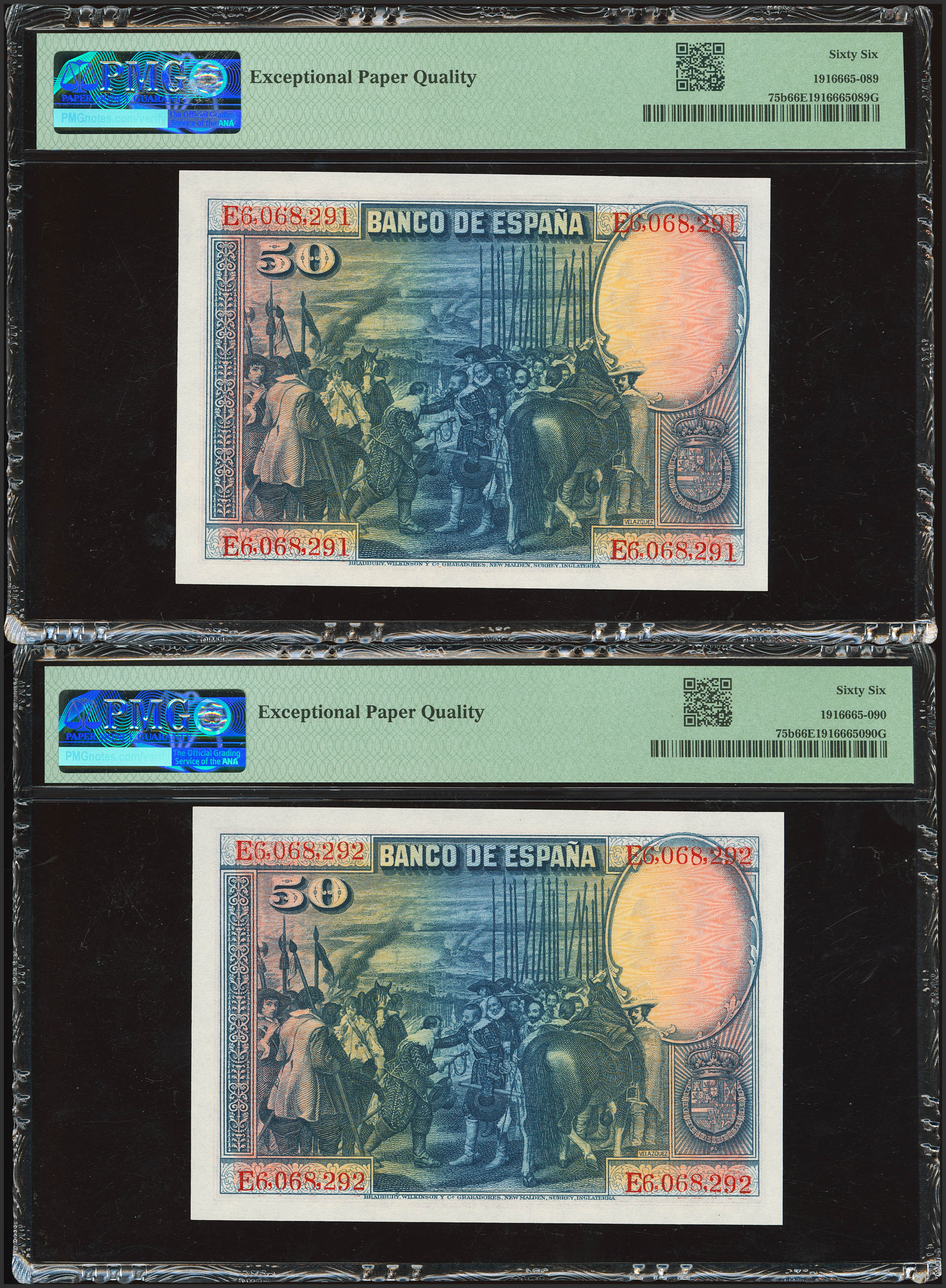 50 Pesetas. 15 de Agosto de 1928. Pareja correlativa. Serie E. (Edifil 2023: 354, Pick: 75b). Apresto original. SC. Encapsulado PMG66EPQ, ambos.