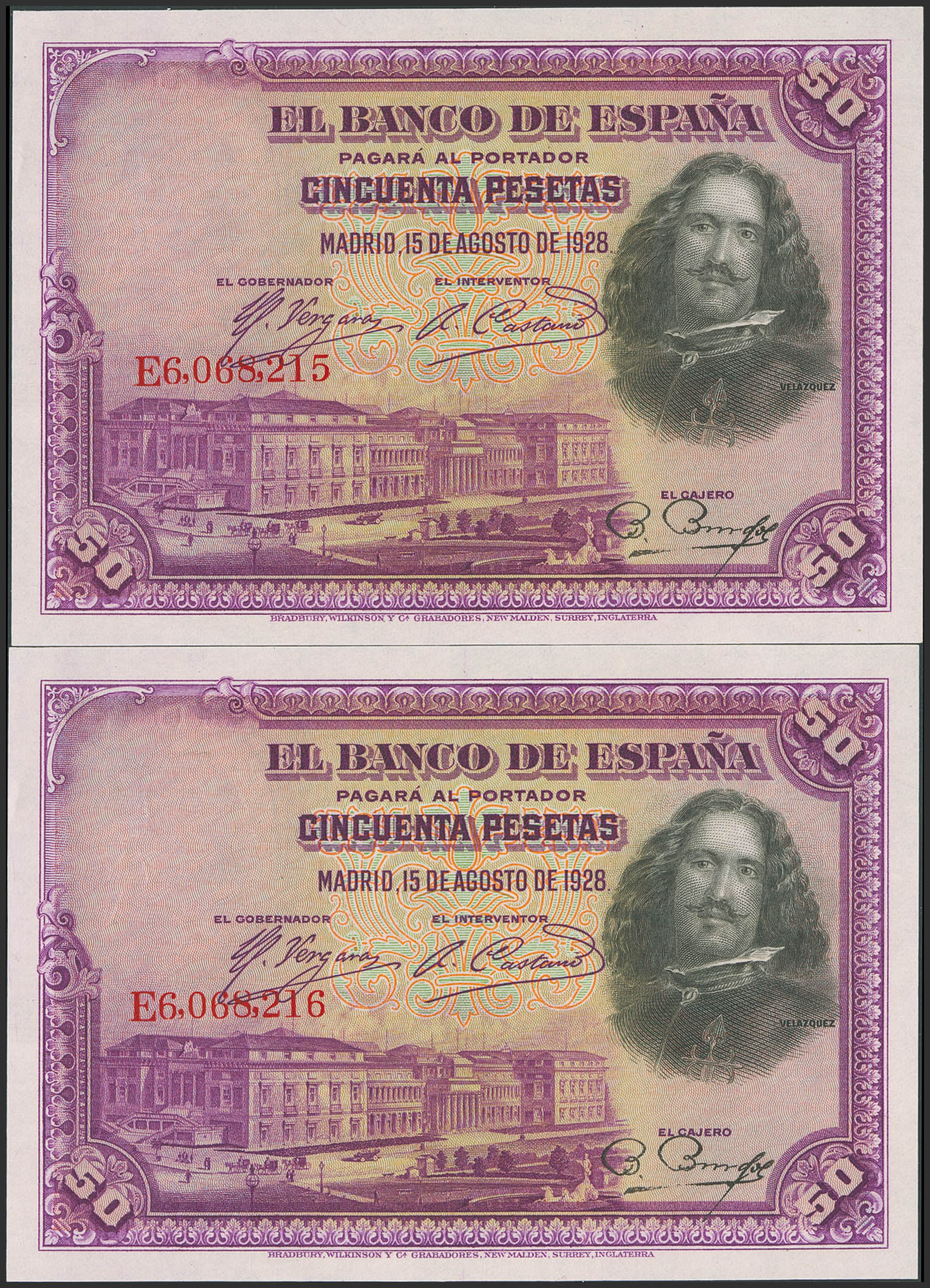 50 Pesetas. 15 de Agosto de 1928. Pareja correlativa. Serie E. (Edifil 2023: 354). Apresto original. SC/SC-.