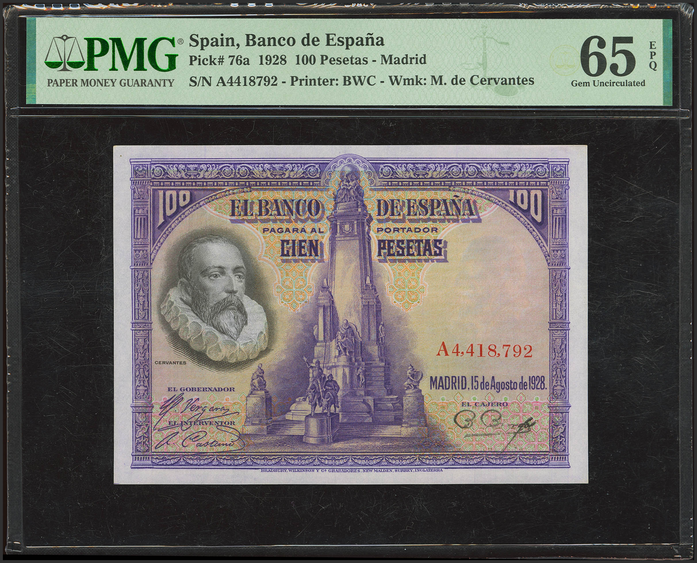 100 Pesetas. 15 de Agosto de 1928. Serie A. (Edifil 2023: 355a, Pick: 76a). Inusual en esta calidad, apresto original. SC. Encapsulado PMG65EPQ.